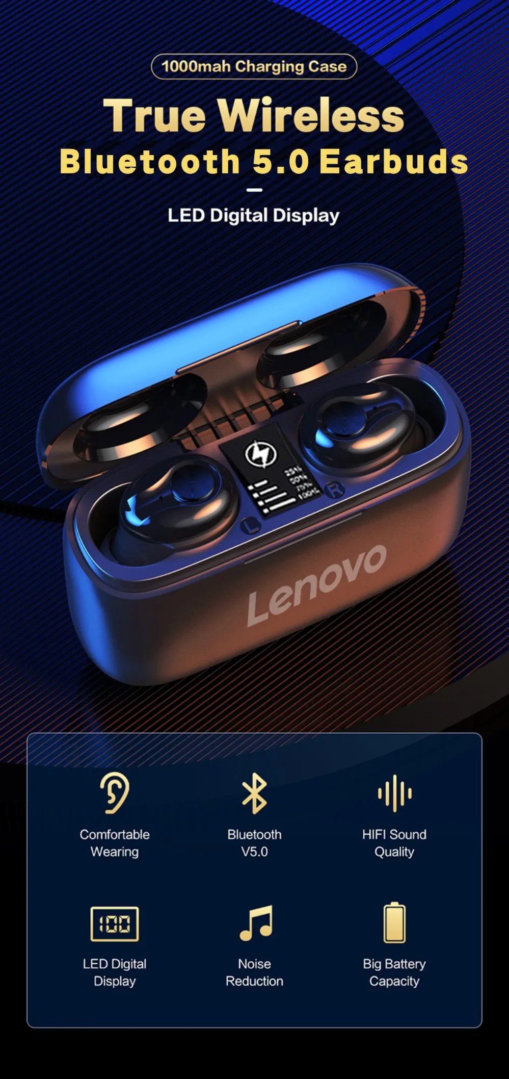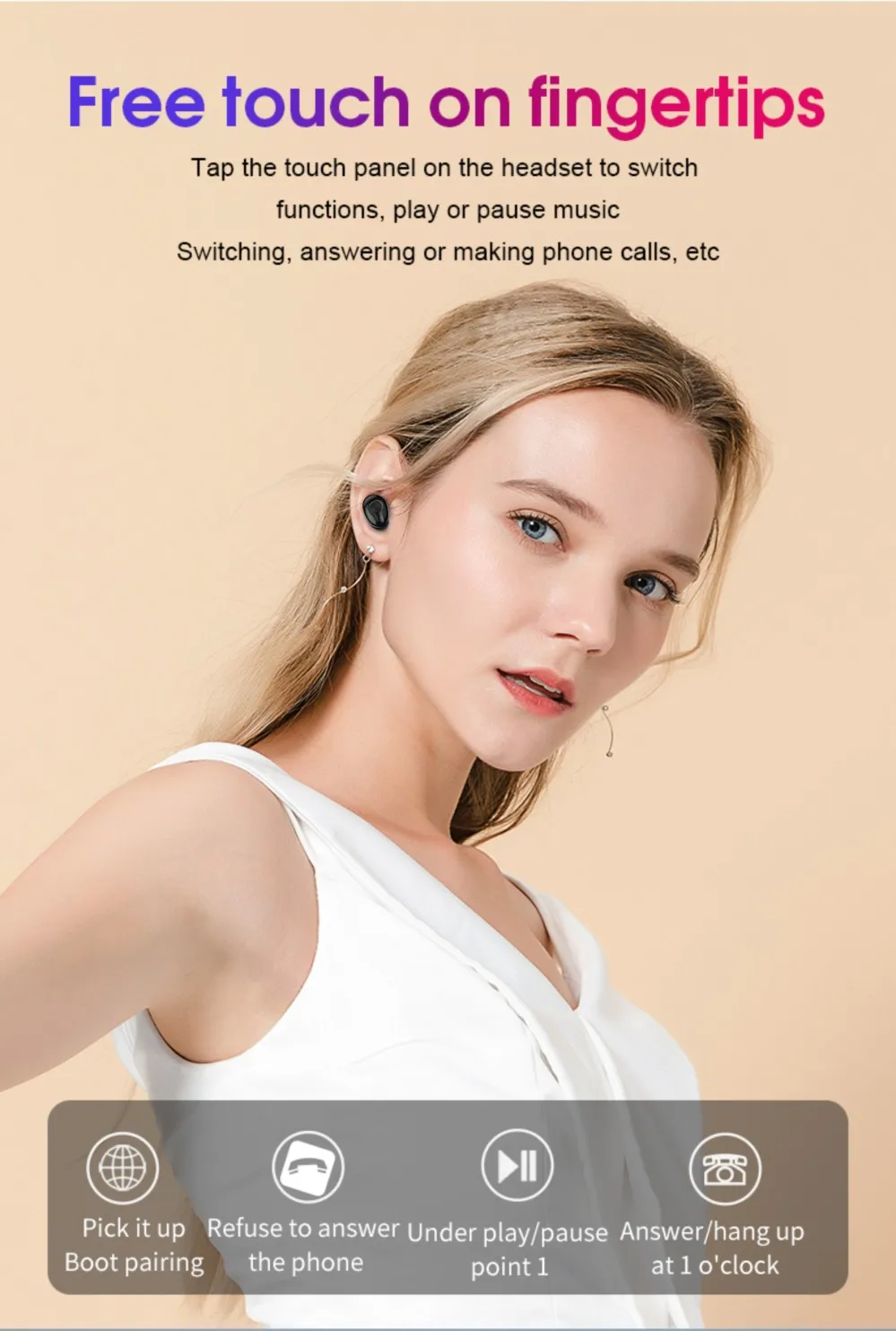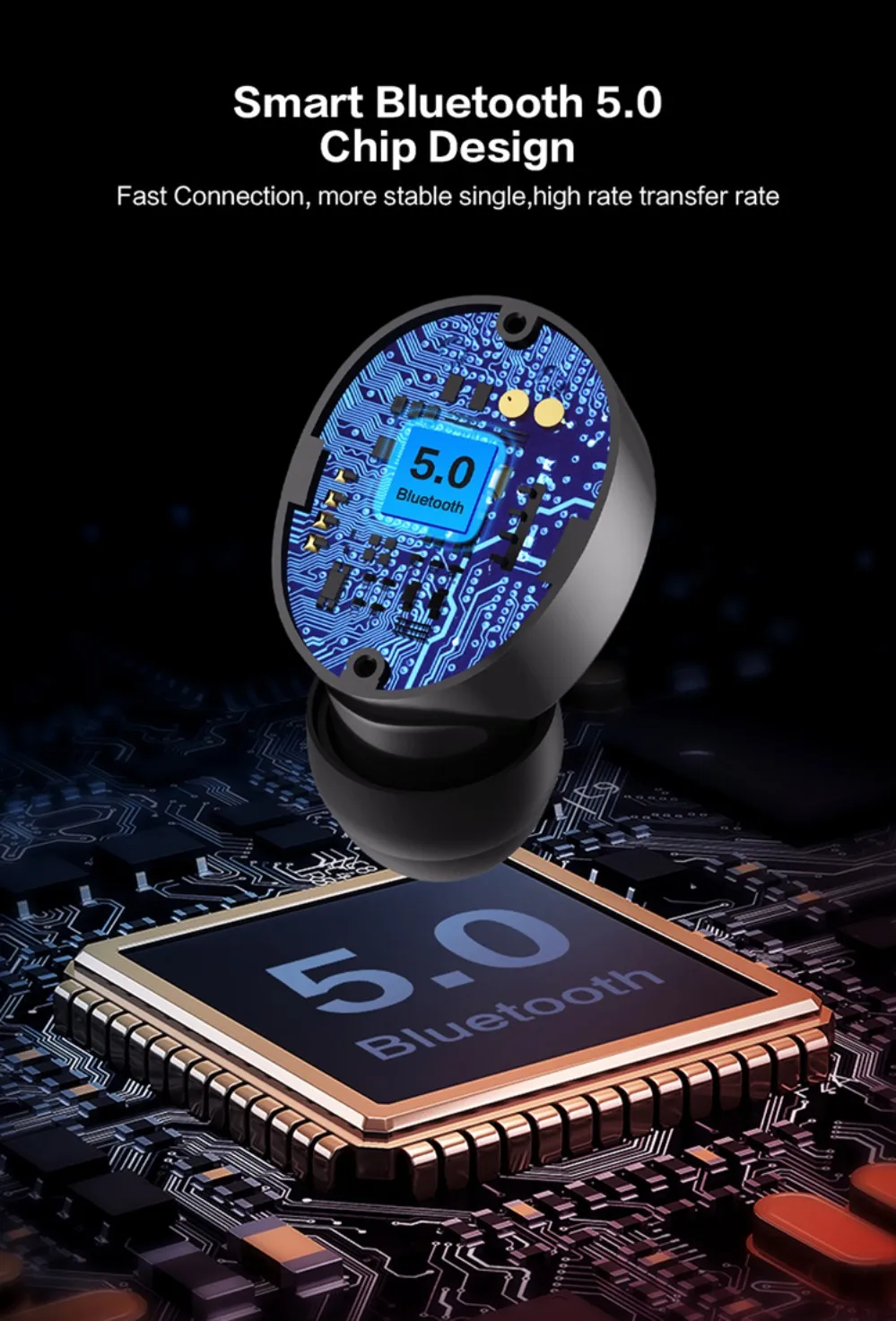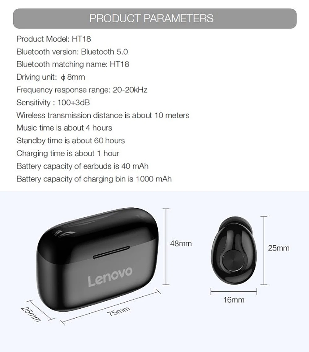Product Name: True Wireless Stereo Earbuds Bluetooth Version: Bluetooth 5.0 Wireless Transmission Distance: 10M Music Time: 4 hours Changing Time of Earbuds: 1 Hours Battery Capacity of Earbuds: 40 mAh Battery Capacity fo Charging Bin: 1000 mAh