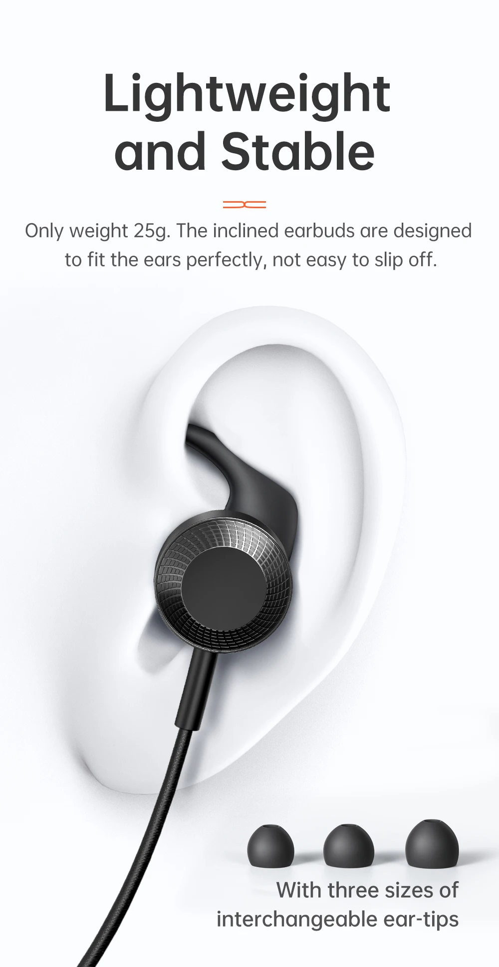 2.Only weight 25g. The inclined earbuds are designed to fit the ears perfectly, not easy to slip off.