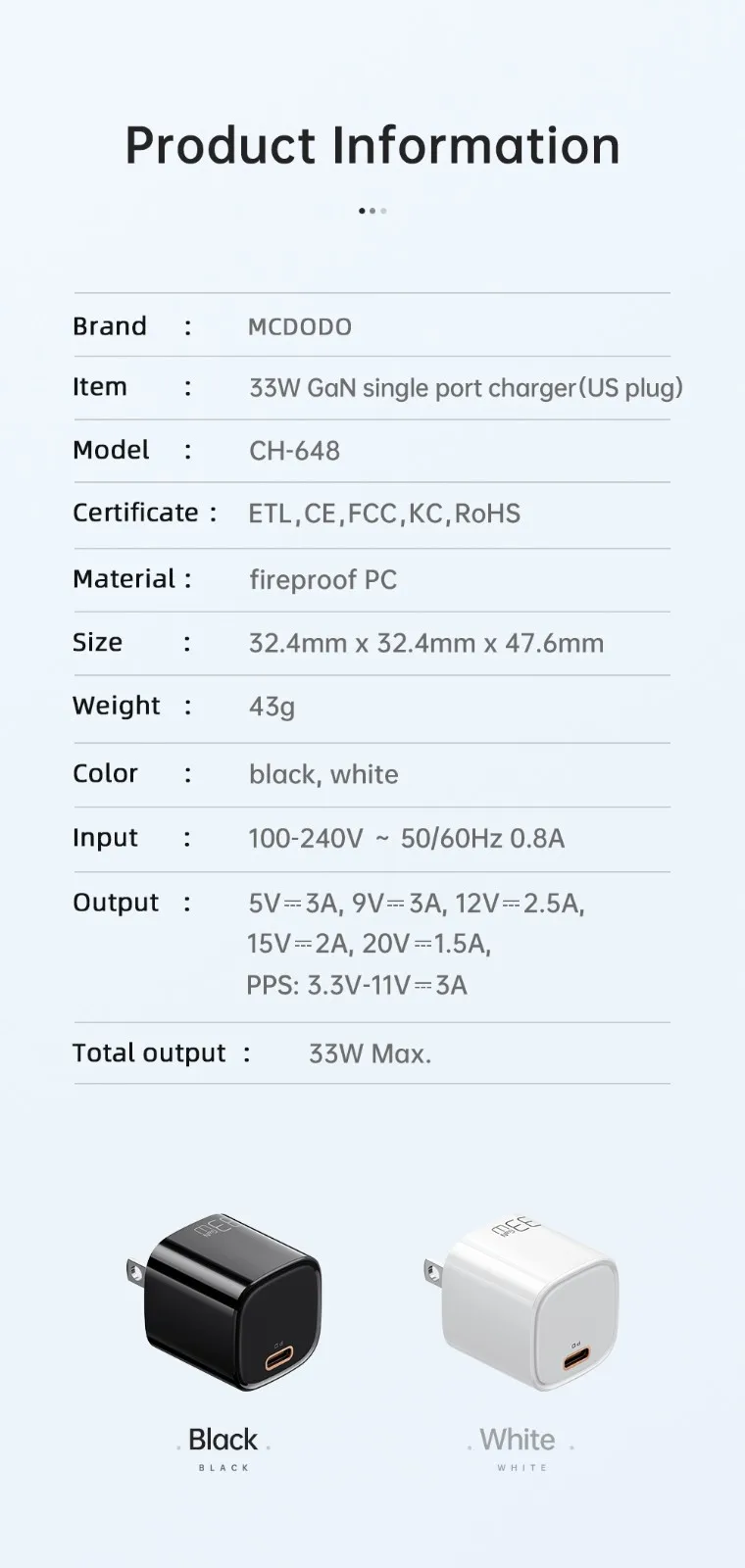USB C:(33W Max.) : 5V/3A,9V/3A,12V/2.5A,15V/2A,20V/1.5V,PPS:3.3V-11V/3A
