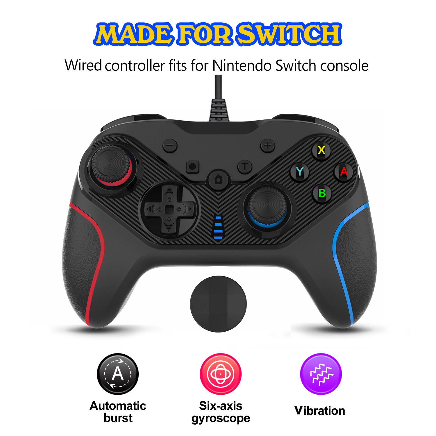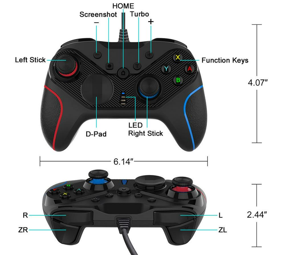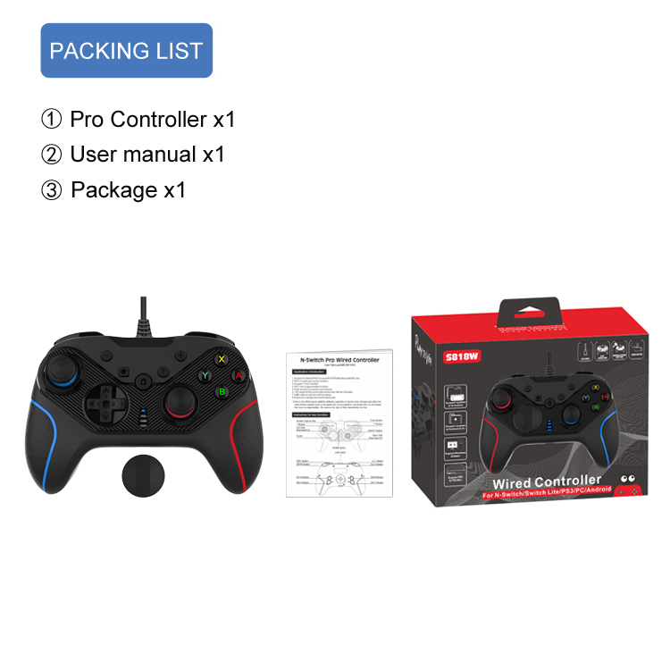 supports one-key wake-up of the Switch host, has a six-axis gyroscope function, somatosensory games are more fun, dual-motor vibration intensity can be adjusted at will, Button burst Turbo, automatic burst AUTO function, USB wired connection to the Switch host can use 3.5mm headset, comes with four programmable buttons, move faster, you can change the height of the joystick according to your habits, replace the wheel steering button