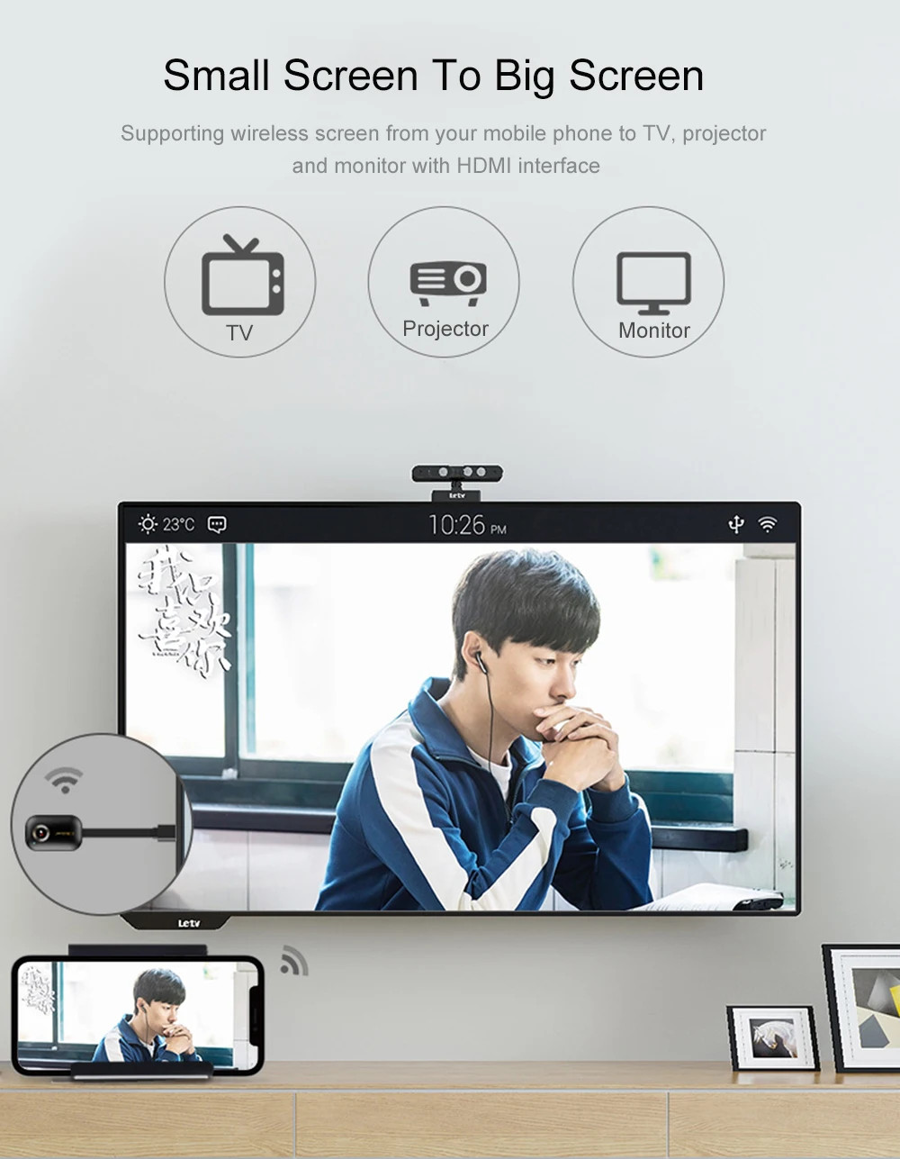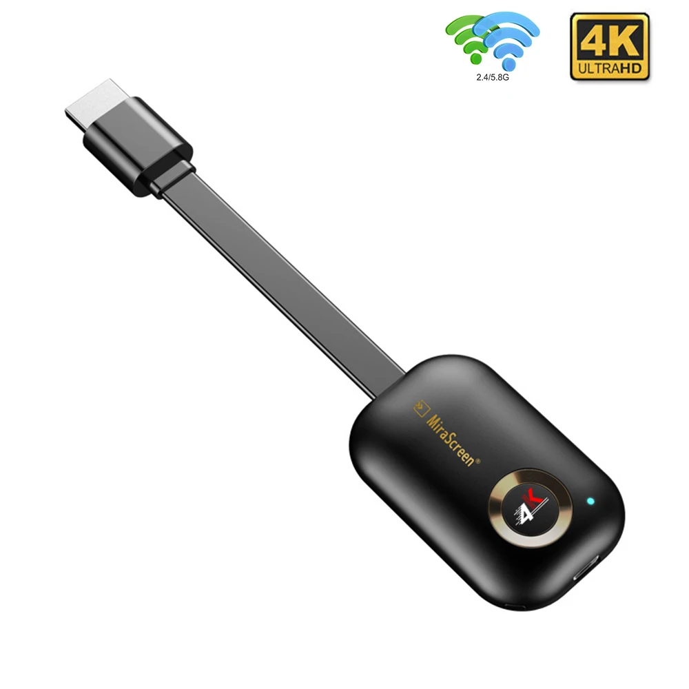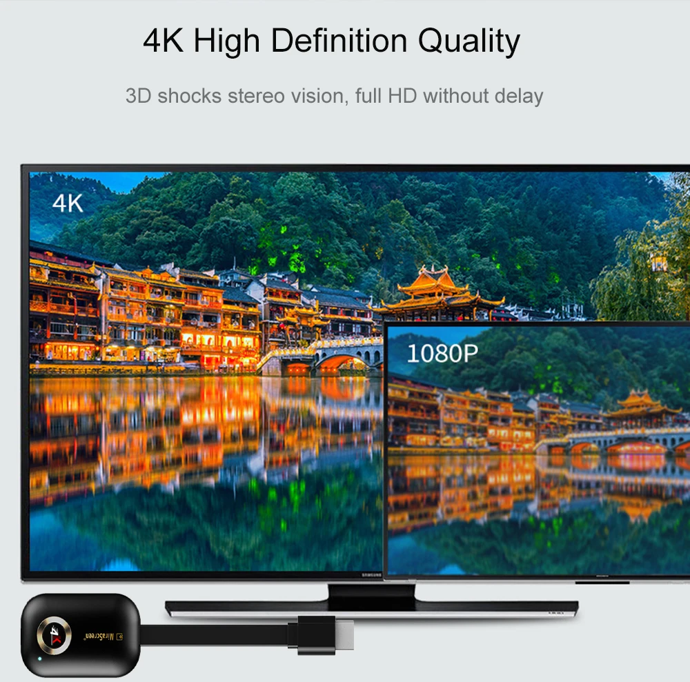 Supports the Miracast standard for Android device, and DLNA for home multimedia application. it also comply with for AirPlay for iOS mirroring. Enjoy screen mirroring with MiraScreen G9 Plus. It allows users to easily share photos, music, videos, PPT and other content in your smart phone, tablet PC to a bigger screen like HDTV or projector. Wireless Display: wireless screen mirroring, sync mirror the entire screen of for iOS and for Android smartphone, tablet PC to HDTV or projector, perfect for PPT presentation and big screen movie. External WiFi module, supports 802.11b/g/n wireless connection, 2.4GHz/5G WiFi, strong signal, supporting video, audio, photo, office file wireless display. Supports multi-OS (for Android/iOS) and supports Miracast, Airplay, and DLNA. Works for iOS 8.0 and above devices with Airplay and for Android 4.2 and above with Miracast. Freely switch between Airplay and Miracast modes without a button. Plug and play, no need to install drivers, easy to operate. Low power consumption and low heat. Supports Full HD wireless audio and video transmission, 4K output with HD interface. Uses compact portable deign for easy carrying. Tpye: WiFi Display Dongle WiFi Band: 2.4G, 5G (Optional) OS: for Linux CPU: AM8272X CPU Speed: 600MHz RAM: DDR3 128MB WiFi Module: 8188FTV WiFi Frequency: 2.4GHz/5G Max. Resolution: 4K Power: 5V 2A File Format: PDF, Word, Excel, Powerpoint, I Works Video Format: AVI, DIVX, MKV, TS, DAT, MPG, MPEG, MOV, MP4, RM, RMVB, WMV Audio Format: MP1, MP2, MP3, WMA, OGG, ADPCM-WAV, PCM-WAV, AAC Photo Format: JPEG, BMP Notes: System Requirement: for iOS 8.0 and above, for Android OS 4.2 or above Please make sure that your smart phone and tablet PC support Miracast, DLNA, Airplay function before you buy it. The WiFi Wireless Display is only compatible with smart phone and tablet PC, not compatible with PC. The WiFi Wireless Display Receiver is not compatible for Netflix, for Amazon Video Client, for HBO go, for Honda Motor. The distance between your smart Phone/tablet PC and the WiFi wireless display receiver should be within 6 meters to ensure better transmission effect. Please place the external WiFi Module in front of your TV, make sure that there is no obstacle between the WiFi module and your smart phone/tablet PC. Due to the light and screen setting difference, the item's color may be slightly different from the pictures. Please allow slight dimension difference due to different manual measurement. Package Includes: 1 x WiFi Display Receiver 1 x 2 in 1 USB & WiFi Module Cable 1 x User Manual (English/Chinese)