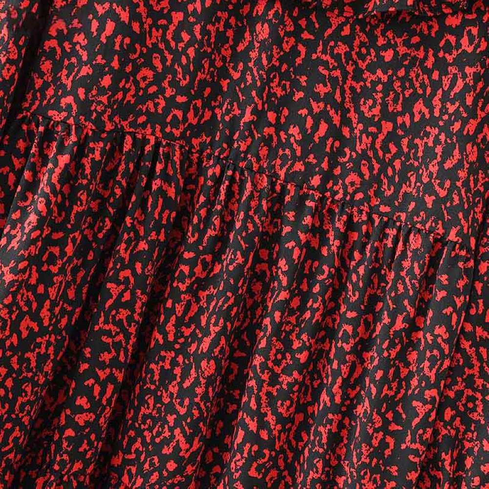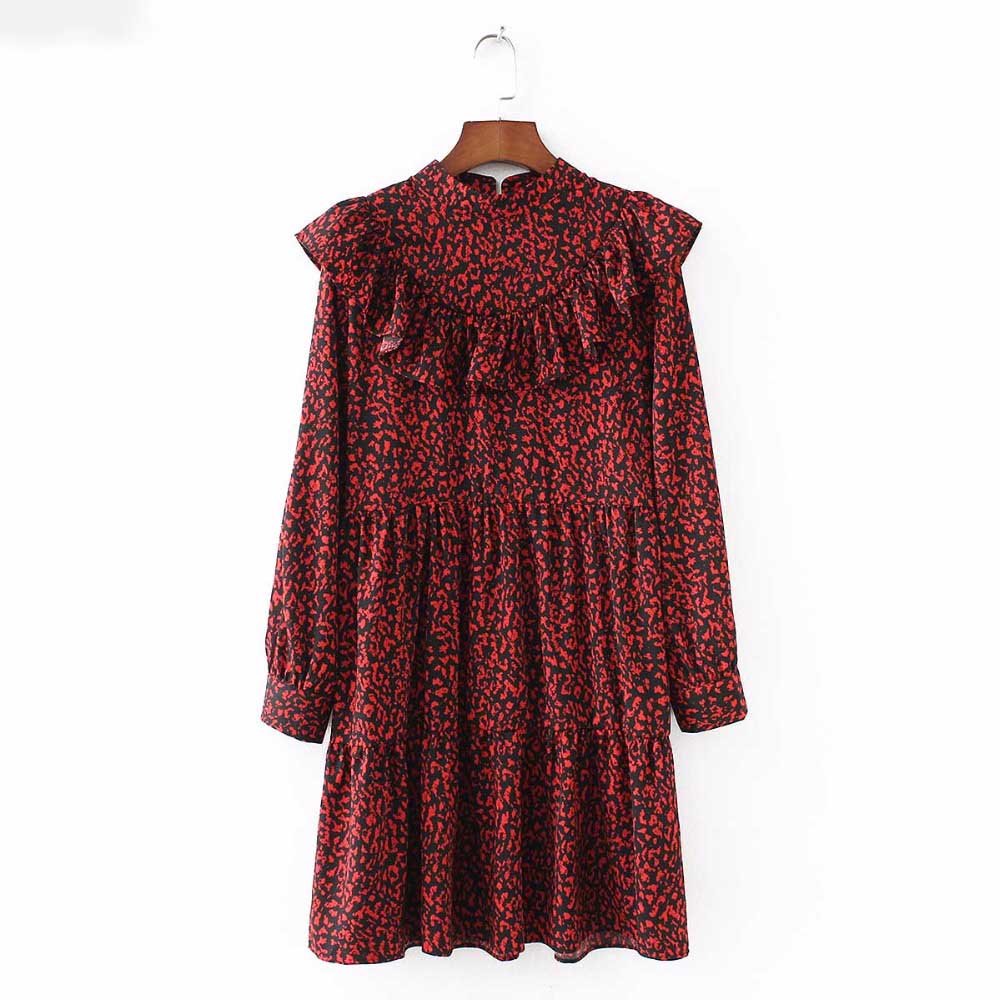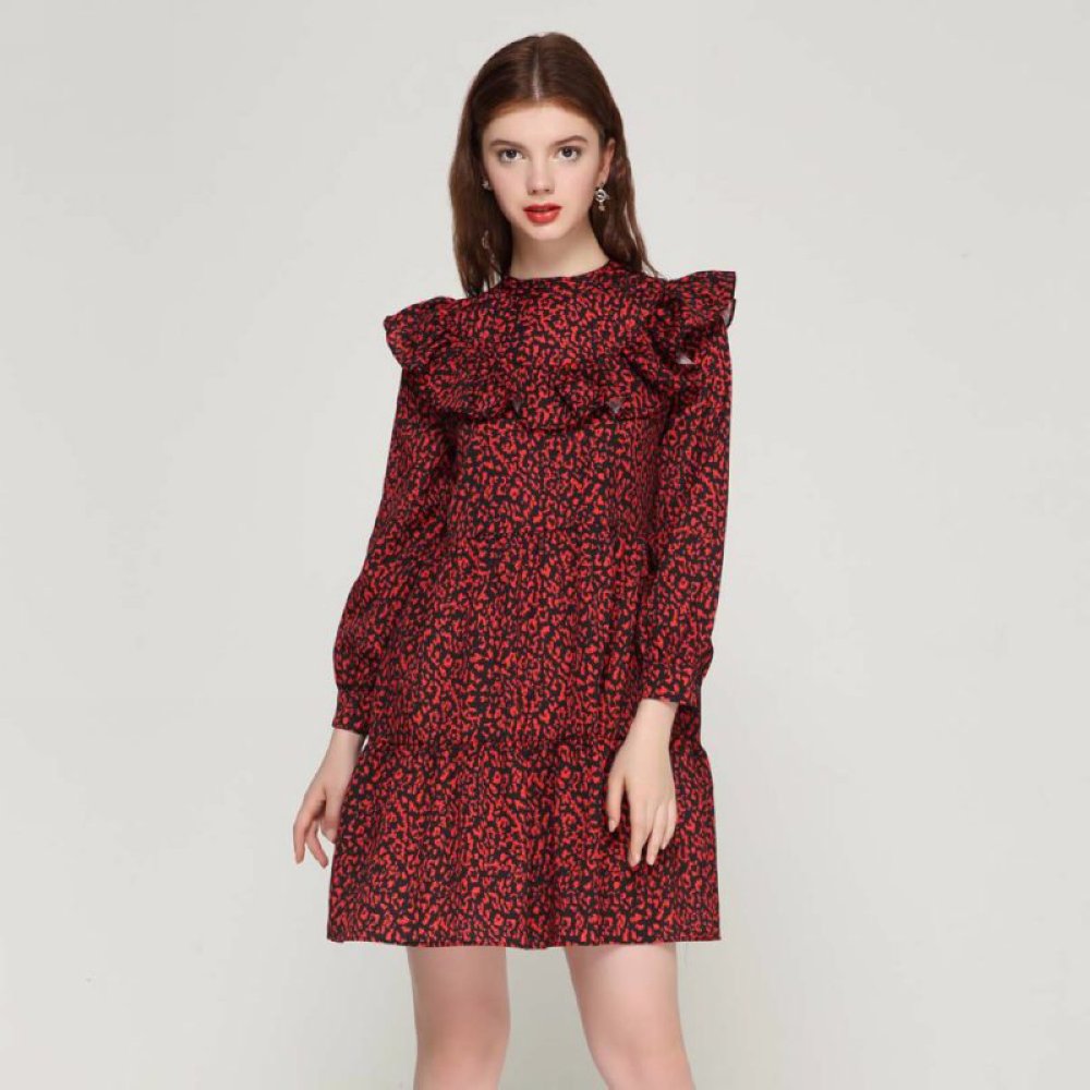 M/L Size OYK8636 Women Vintage Leopard Pattern Sweet Ruffles Long Sleeve O-Neck Pleated Casual Straight Dress