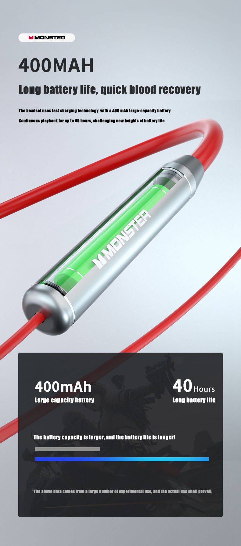 1. The Neckband earphone uses fast charging technology and is equipped with a 400 mAh large-capacity battery for up to 40 hours of continuous playback.