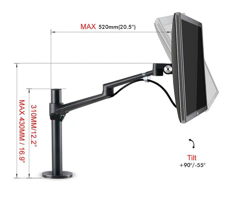 Material: Aluminum alloy + ABS Suggested Screen Size: 17-32inch Loading Capacity: 2-8kgs VESA: 75*75/100*100mm Tube Height: 310mm (12.2") Head Tilt: +90°/-55° Head Swivel: +90°/-90° Head Rotation: 360° Arm Swivel: 180° Base Swivel: ±120° Color: Siver Grey / Black Installation: desktop clamping/ Grommet Mount Desk thickness: 20-60mm for desktop clamping; Grommet Mount Hole ≥60mm