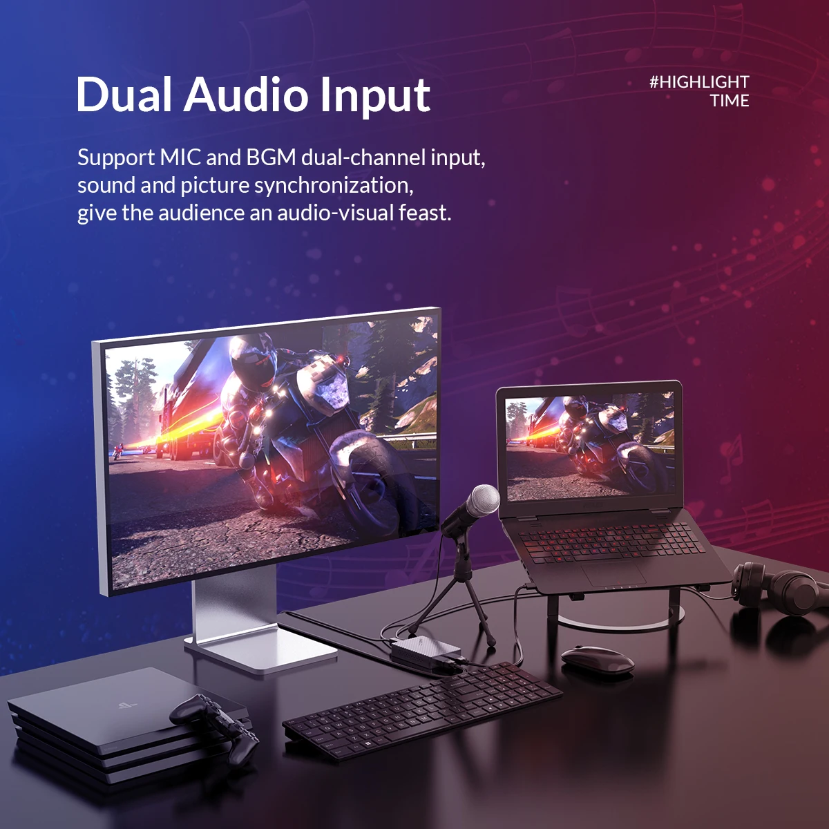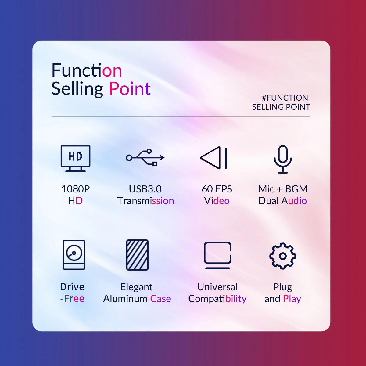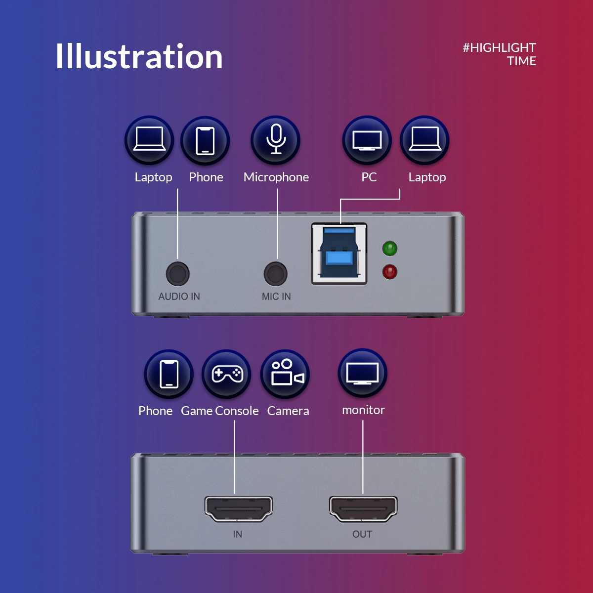 1080P@60 Hz input, 1080P@60Hz loop out, 1080P@60Hz recording; Support two audio input, microphone and background music input, 16 bit/48000Hz; The design of aluminum alloy shell and side cooling holes is conducive to overall heat dissipation; Support game console, computer, mobile game live broadcast, conference, teaching video recording; Hard pressure processing, does not consume computer performance; Supporting operating systems: Windows 7, Windows 8, Windows 10, Linux, MAC OS, Android, IOS;