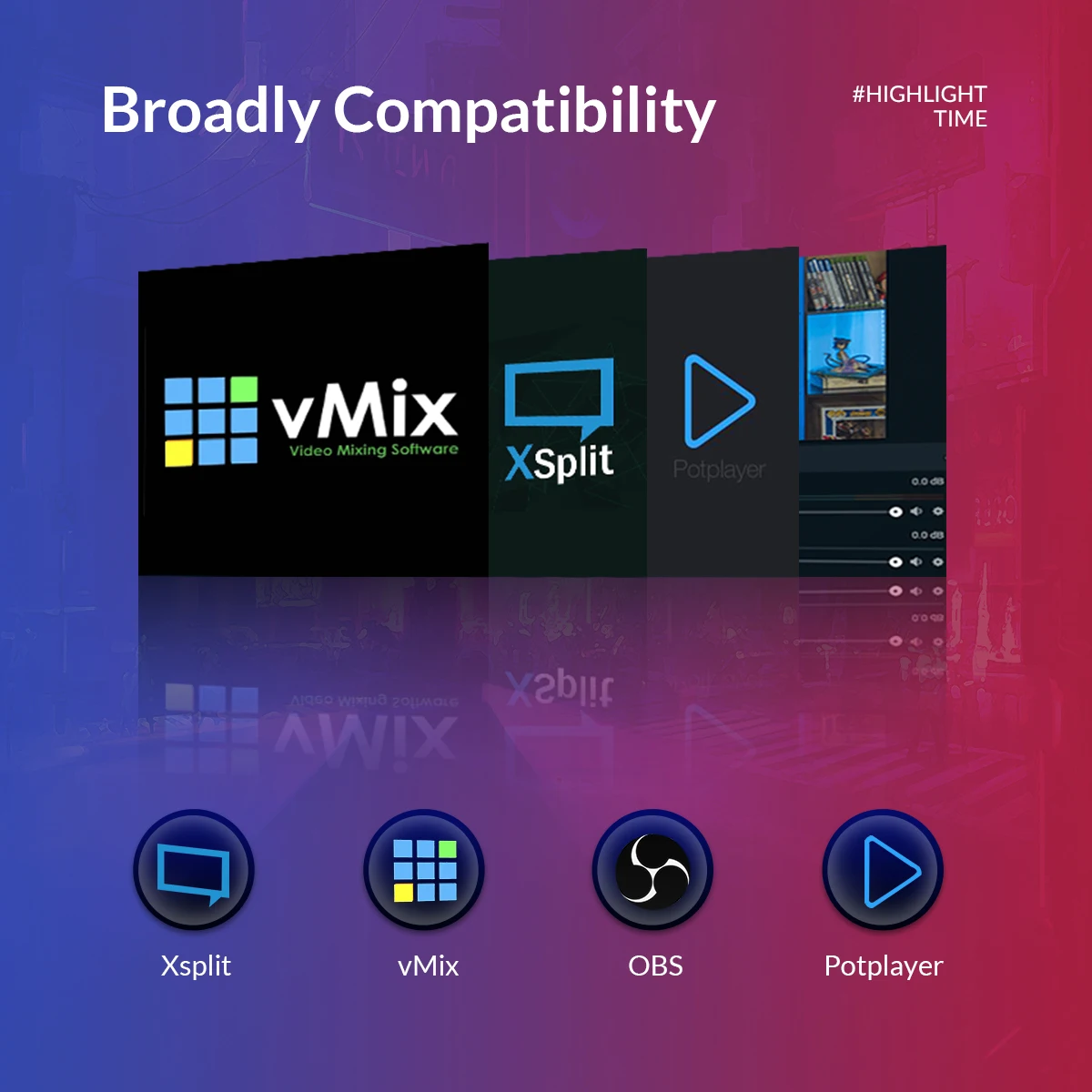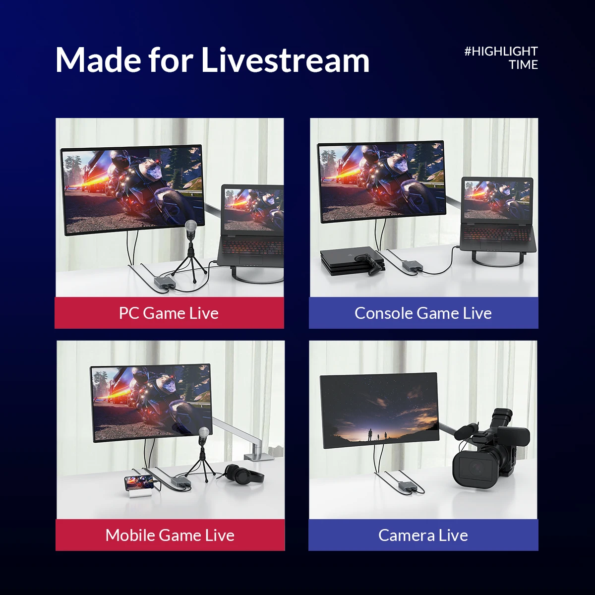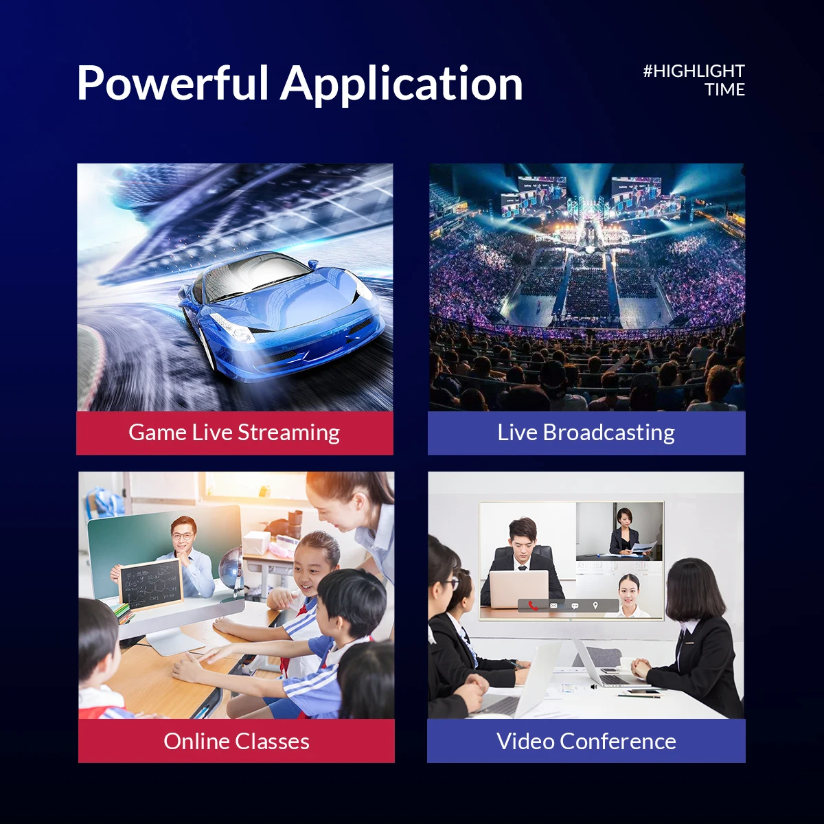 1080P@60 Hz input, 1080P@60Hz loop out, 1080P@60Hz recording; Support two audio input, microphone and background music input, 16 bit/48000Hz; The design of aluminum alloy shell and side cooling holes is conducive to overall heat dissipation; Support game console, computer, mobile game live broadcast, conference, teaching video recording; Hard pressure processing, does not consume computer performance; Supporting operating systems: Windows 7, Windows 8, Windows 10, Linux, MAC OS, Android, IOS;