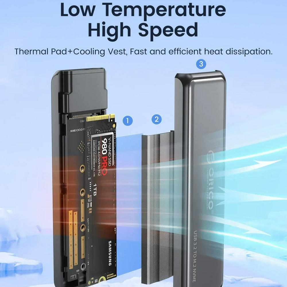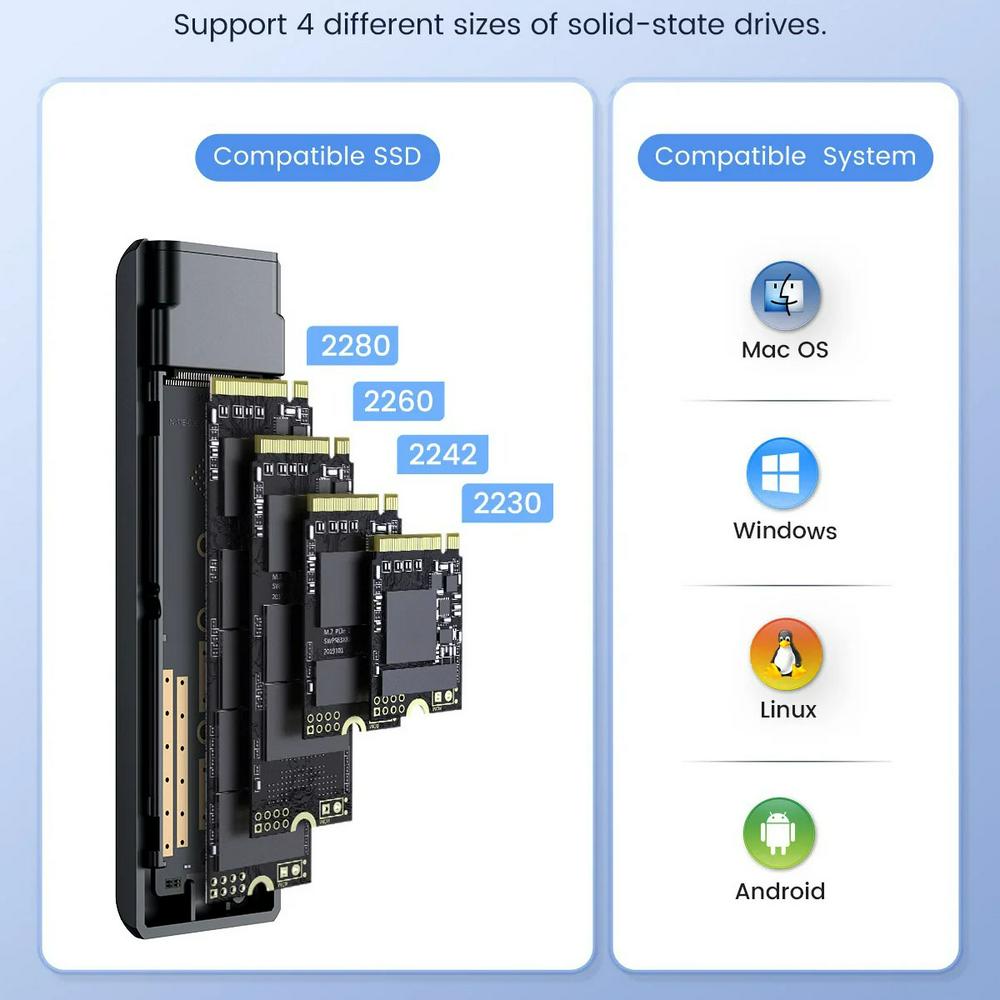 There are 3 models optional, please confirm your M.2 SSD protocol before ordering. (1)SATA 5Gbps Model Only support NGFF SATA protocol B key/M&B Key SSD, with 30cm Type-C to USB-A cable. (2)NVMe 10Gbps Model Only support NVME protocol M key/M&B Key SSD, with 30cm USB-C to USB-C/USB-A 2 in 1 data Cable. (3)SATA&NVMe Dual Protocol Model-2 in 1 Cable Support M Key(NVMe Protocol) / M&B Key (both NVME and SATA Protocol) SSD, not compatible with B Key SSD, with 30cm USB-C to USB-C/USB-A 2 in 1 data Cable.