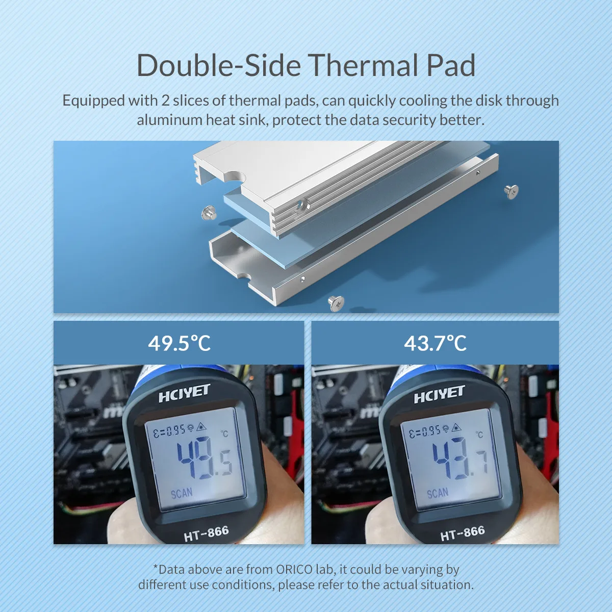 Double-side thermal pad, equipped with 2 slices of thermal pads, can quickly cooling the disk through aluminum heat sink, protect the data security better