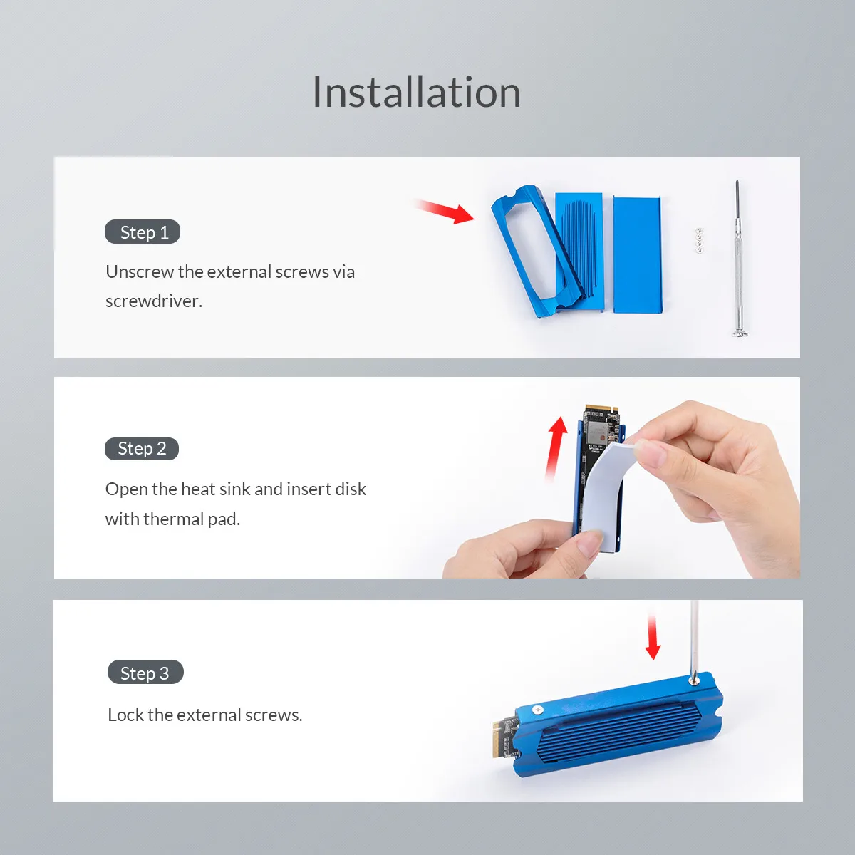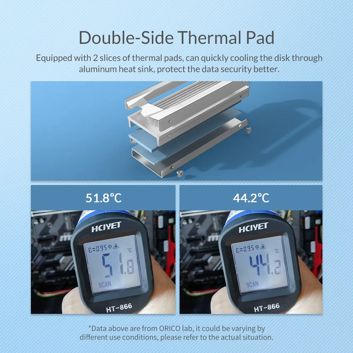Double-side thermal pad, equipped with 2 slices of thermal pads, can quickly cooling the disk through aluminum heat sink, protect the data security better