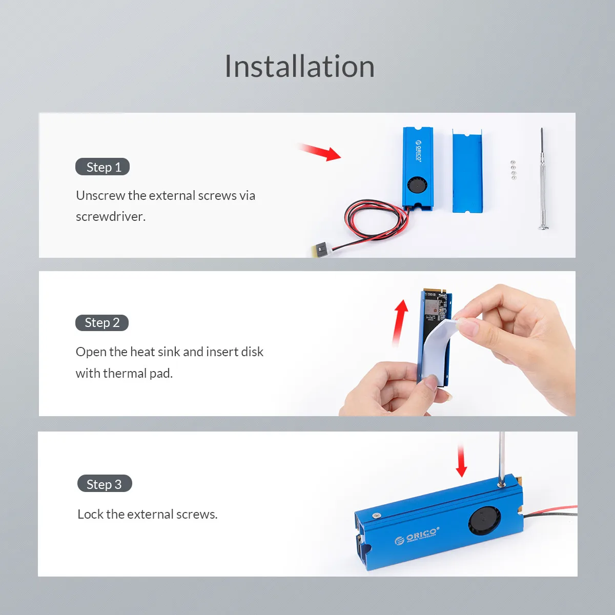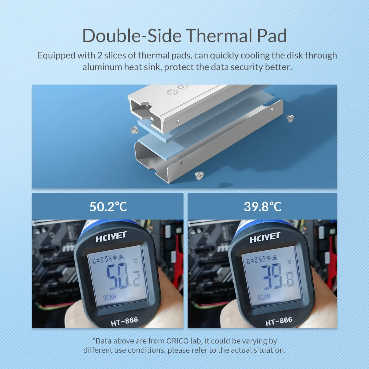 Double-side thermal pad, equipped with 2 slices of thermal pads, can quickly cooling the disk through aluminum heat sink, protect the data security better