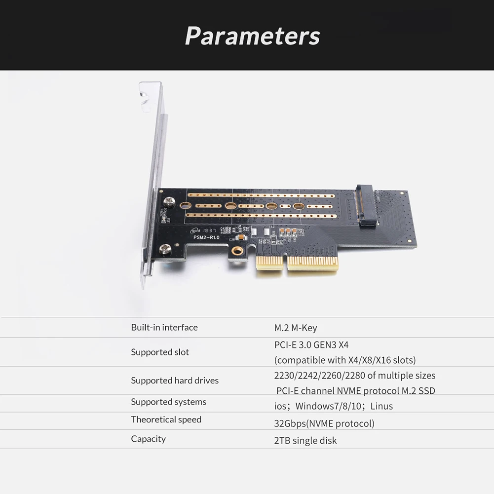 ORICO PSM2-X4 NVMe M.2 NGFF M Key to PCIe 3.0 X4 Expansion Card 2230 2242 2260 2280 M.2 SSD Adapter Specification: Brand: ORICO Model: PSM2-X4 Built-in interface: M.2 M key Interface supported slot: PCI-e 3.0 Gen3 X4 Supported hard drive: for 2230 / 2242 / 2260 / 2280 PCI-e NVMe M.2 SSD Supported system: for iOS; for Windows7 / 8 / 10; for Linux Theoretical transmission rate: 32Gbps (NVMe protocol) Supported capacity: 2TB per drive Package size: 130 * 80 * 35mm/5.12*3.15*1.38" Product gross weight: 80g Note: 1. There may be slight size deviations due to manual measurement, different measuring methods and tools. 2. The picture may not reflect the actual color of the item because of different photographing light, angle and display monitor.