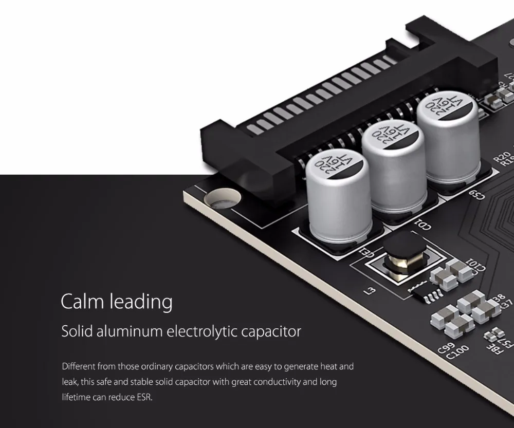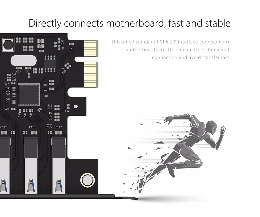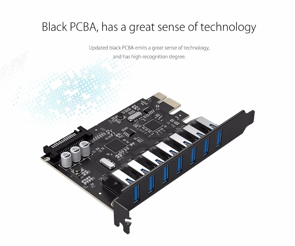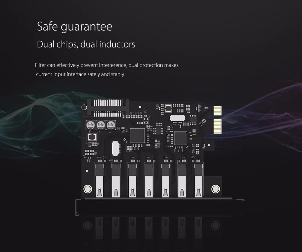 Update port, expanding 7 port which can perform well after millions plugging test. Thickened standard PCI-E 2.0 interface connecting to motherboard directly, can increase stability of connection and avoid transfer loss.