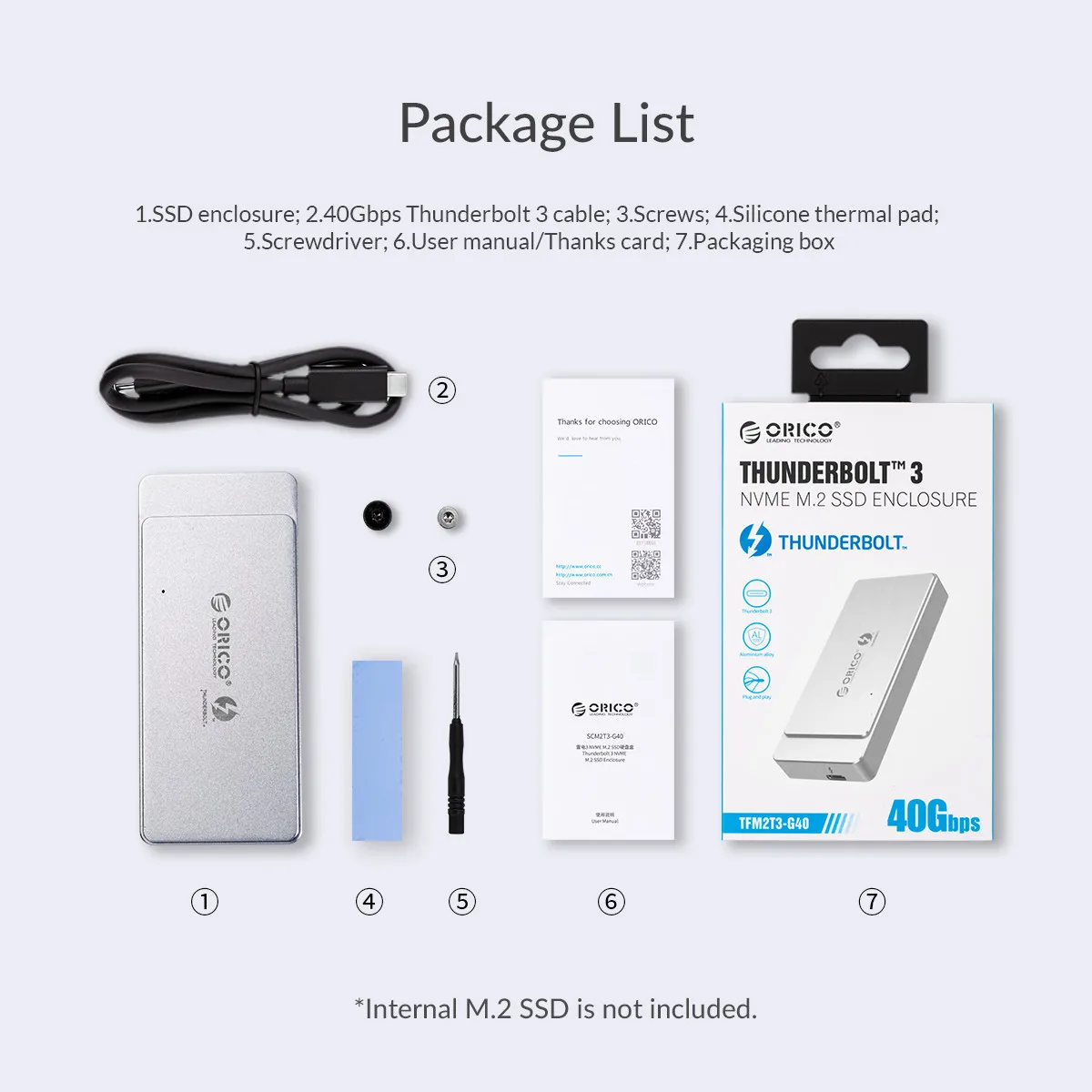 1.Thunderbolt 3 SSD Enclosure 2.40Gbps Thunderbolt 3 C to C Cable 3.Screws 4.Silicone thermal pad 5.Screwdriver 6.User Manual/Thanks Card 7.Packaging Box