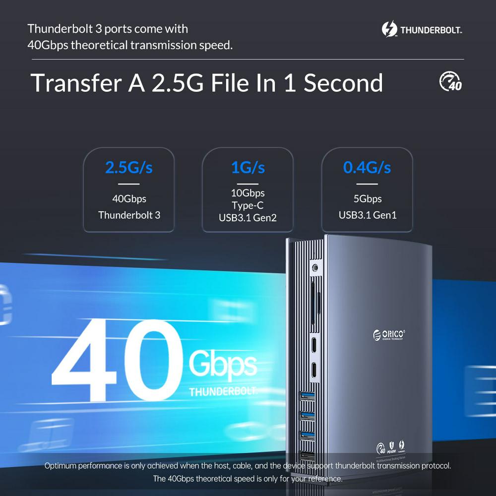 Thunderbolt 3 ports come with 40Gbps theoretical transmission speed.