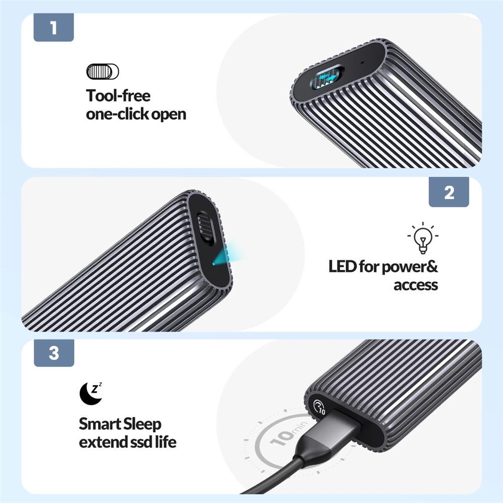 ORICO 10Gbps M.2 SSD Enclosure is compatible with M Key or M&B Key's 2230 2242 2260 2280 M.2 PCIe NVMe SSD. SSD enclosure support Windows, Mac OS and Linux. Plug and play, no additional drivers or software required.