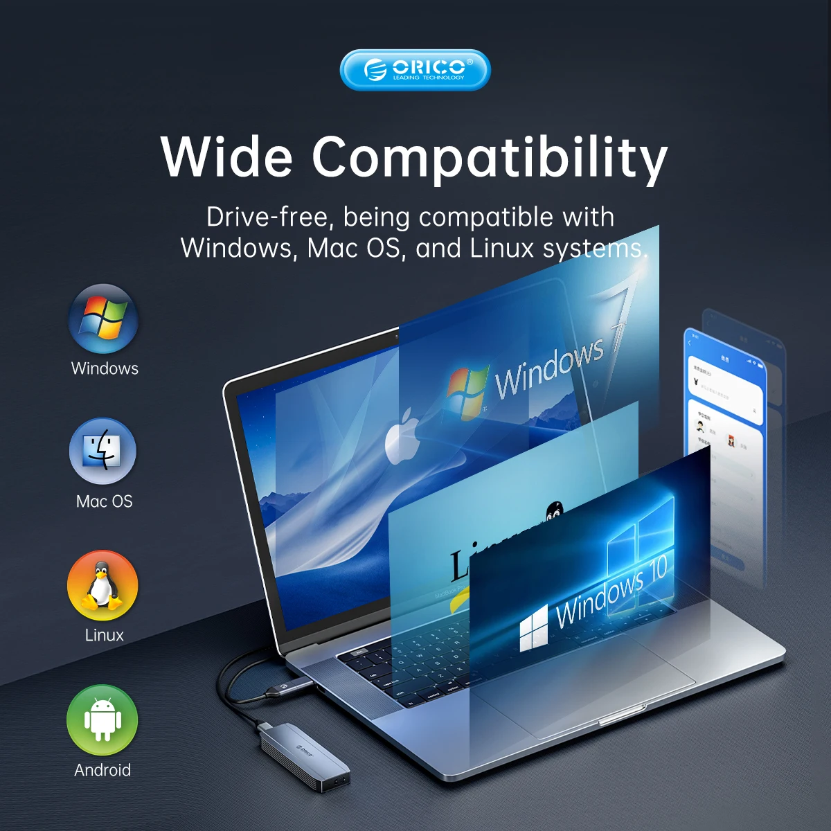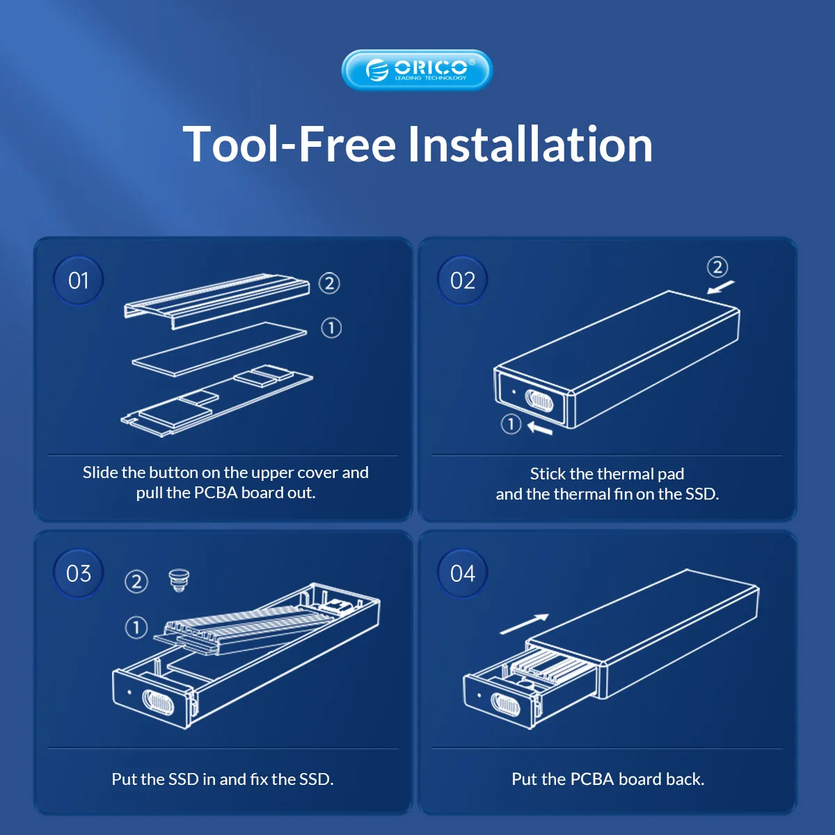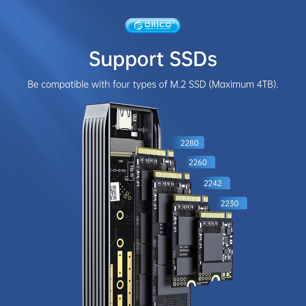 ORICO 10Gbps M.2 SSD Enclosure is compatible with M Key or M&B Key's 2230 2242 2260 2280 M.2 PCIe NVMe SSD. SSD enclosure support Windows, Mac OS and Linux. Plug and play, no additional drivers or software required.