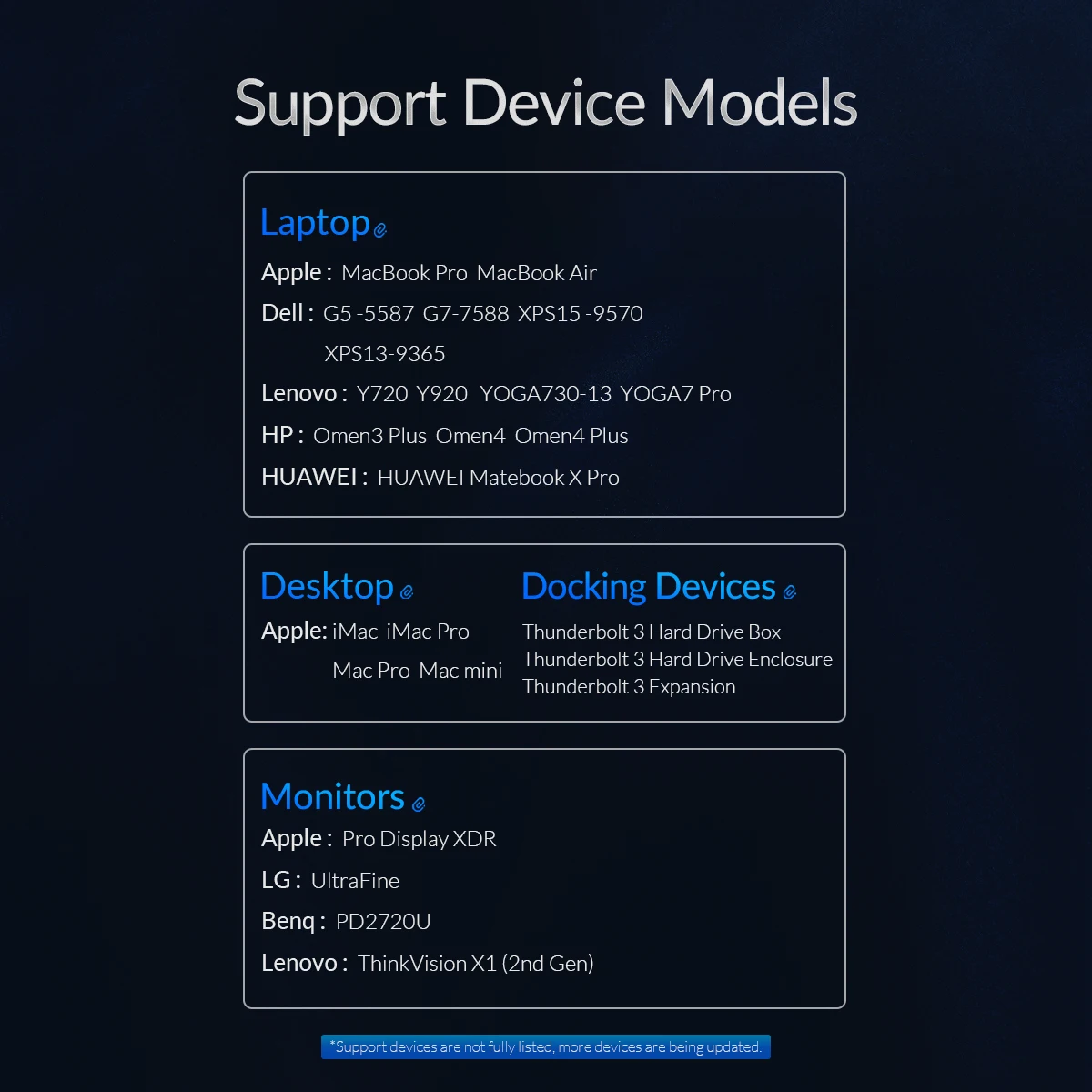 Compatible with Thunderbolt 3 cable supplies up to 100 Watts of power delivery for rapid charging. Compatible with Macbook Pro Macbook Ai,DELL ,HUWWEI and so on...