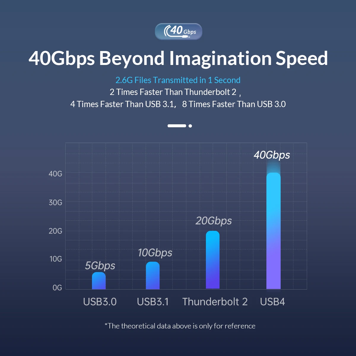 2.6G Files Transmitted in 1 Second,2 Times Faster Than Thunderbolt 24Times Faster Than USB 3.1, 8 Times Faster Than USB 3.0.(The theoretical data above is only for reference,and the speed will be affected by the equipment)