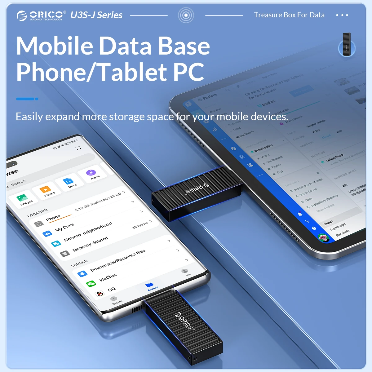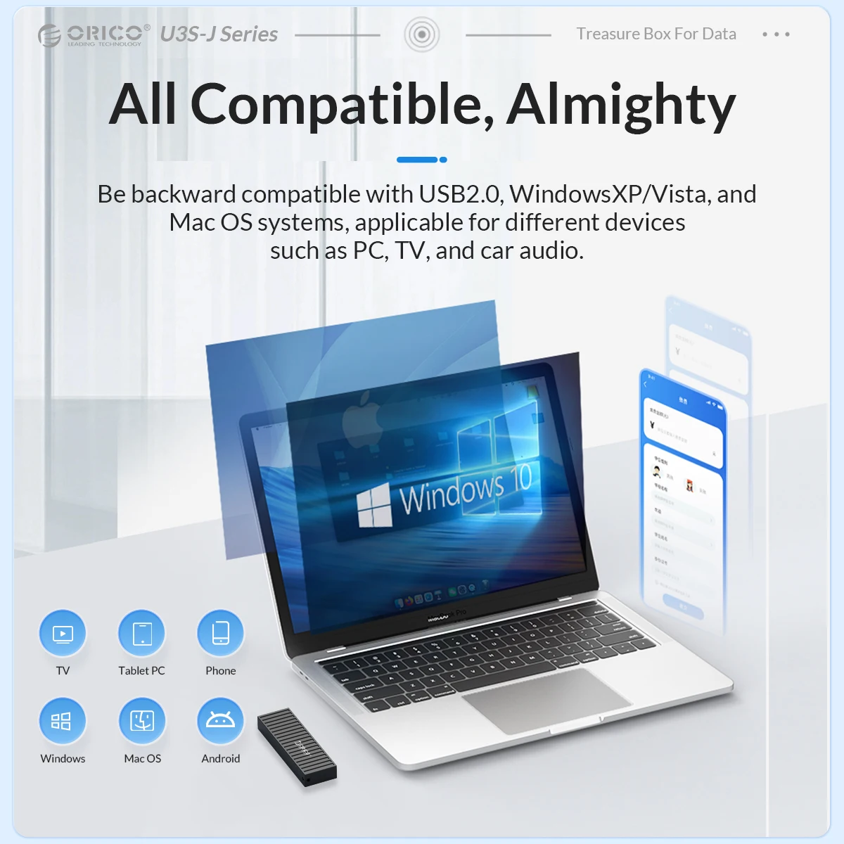The ORICO USB3.2 Gen1 Flash Drive features a stylish yet tough metal casing that protects the drive from unexpected knocks.
