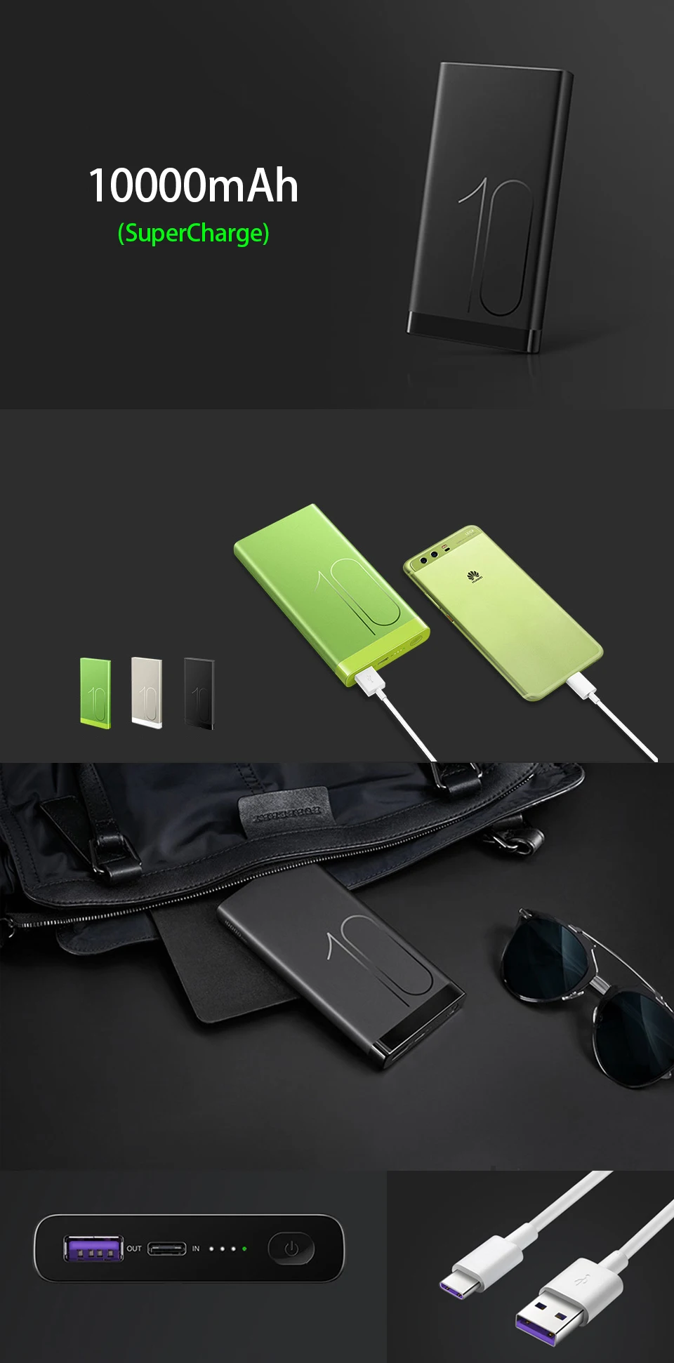 Supports Huawei two-way 22.5W supercharge, it is able to be fully charged in 2.5 hours, much faster than common 5V/2A charger, which needs 5.5 hours to charge a 10000mAh power bank fully.