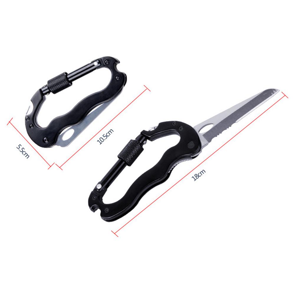 Multi-purpose tool can be used as a knife, hanging carabiner, Phillips screwdriver, screwdriver, glass breaker, bottle opener and an edc key ring.