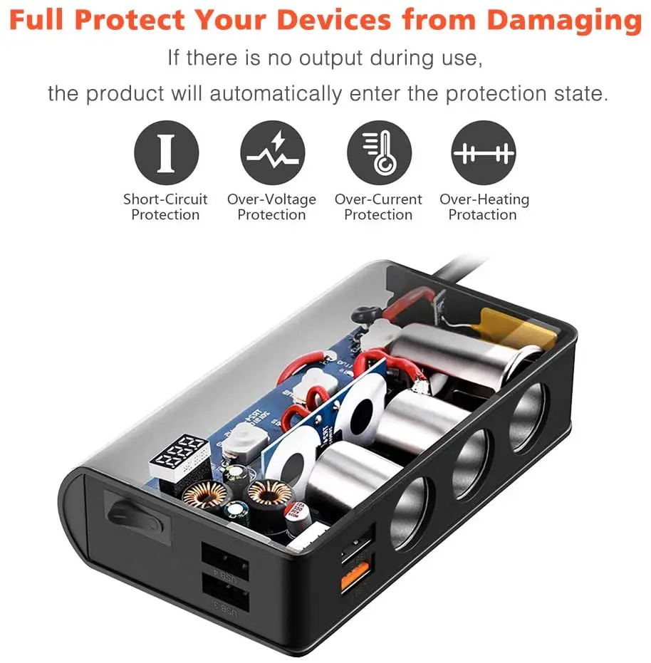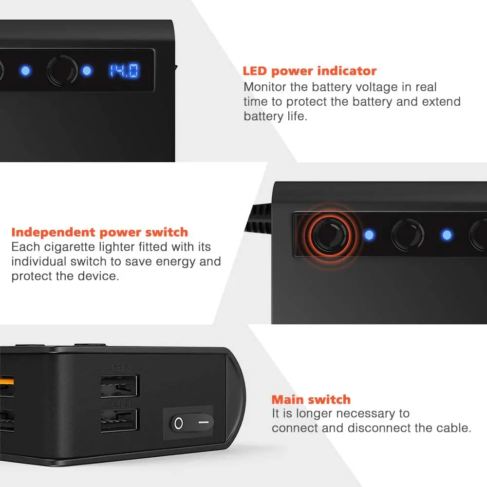 4.180W Cigarette Lighter Power Sockets,This car charger provide a total power up to 180W, and single socket power is not exceed 100W. All the sockets are manufactured in accordance with international standards, can fit for multiple car appliances like Dash Cam, GPS, Sat Nav, Seat Heater, Car Humidifier, Car Fan etc.
