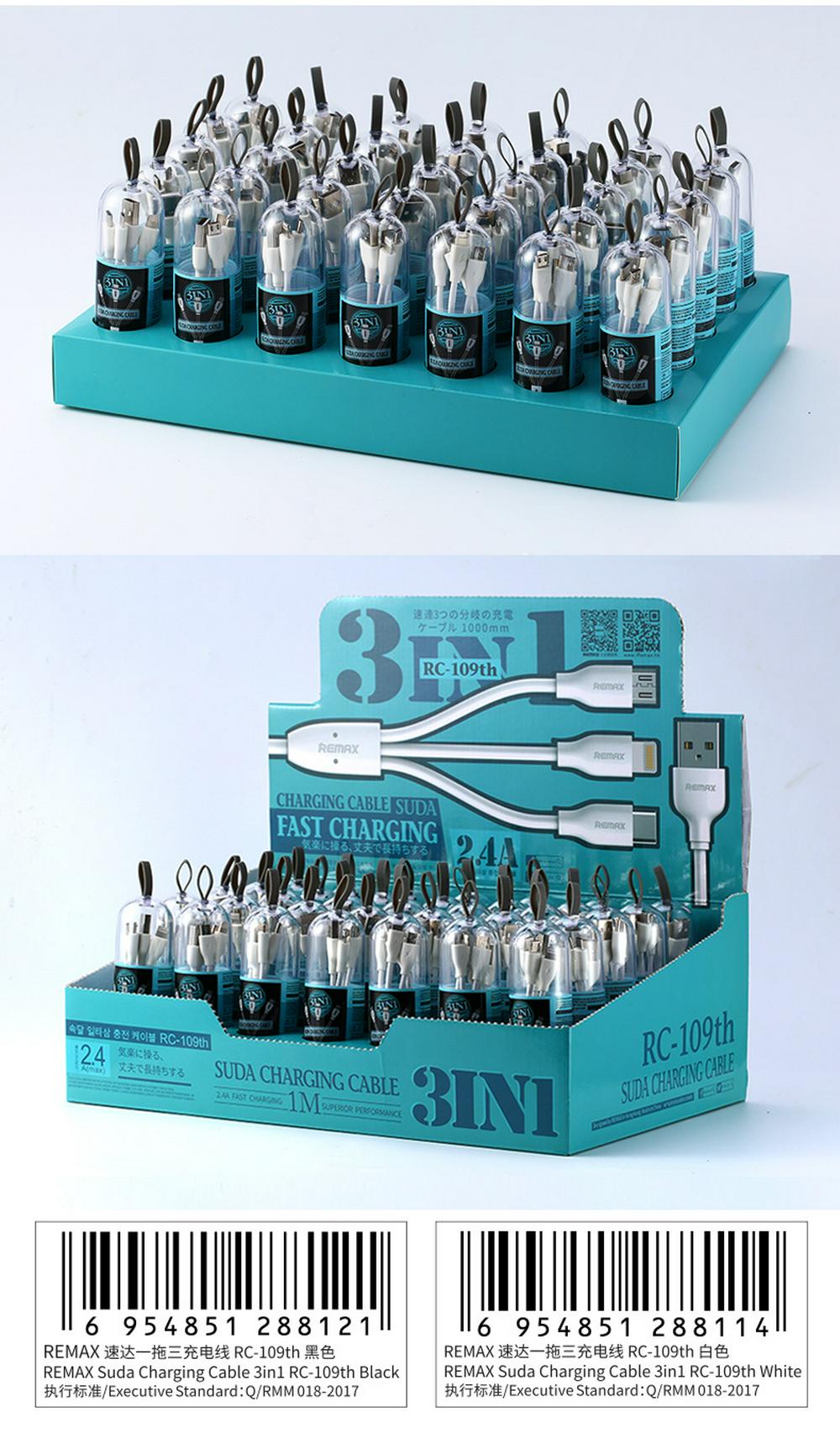 REMAX RC-109th Suda 3 in 1 Type-C + 8 Pin + Micro USB Ports 1m 2.4A Fast Charging Date Charging Cable for Smart Phones with Type-C 8 Pin Micro Interfaces