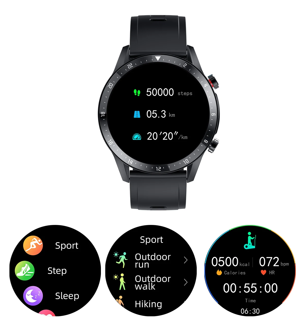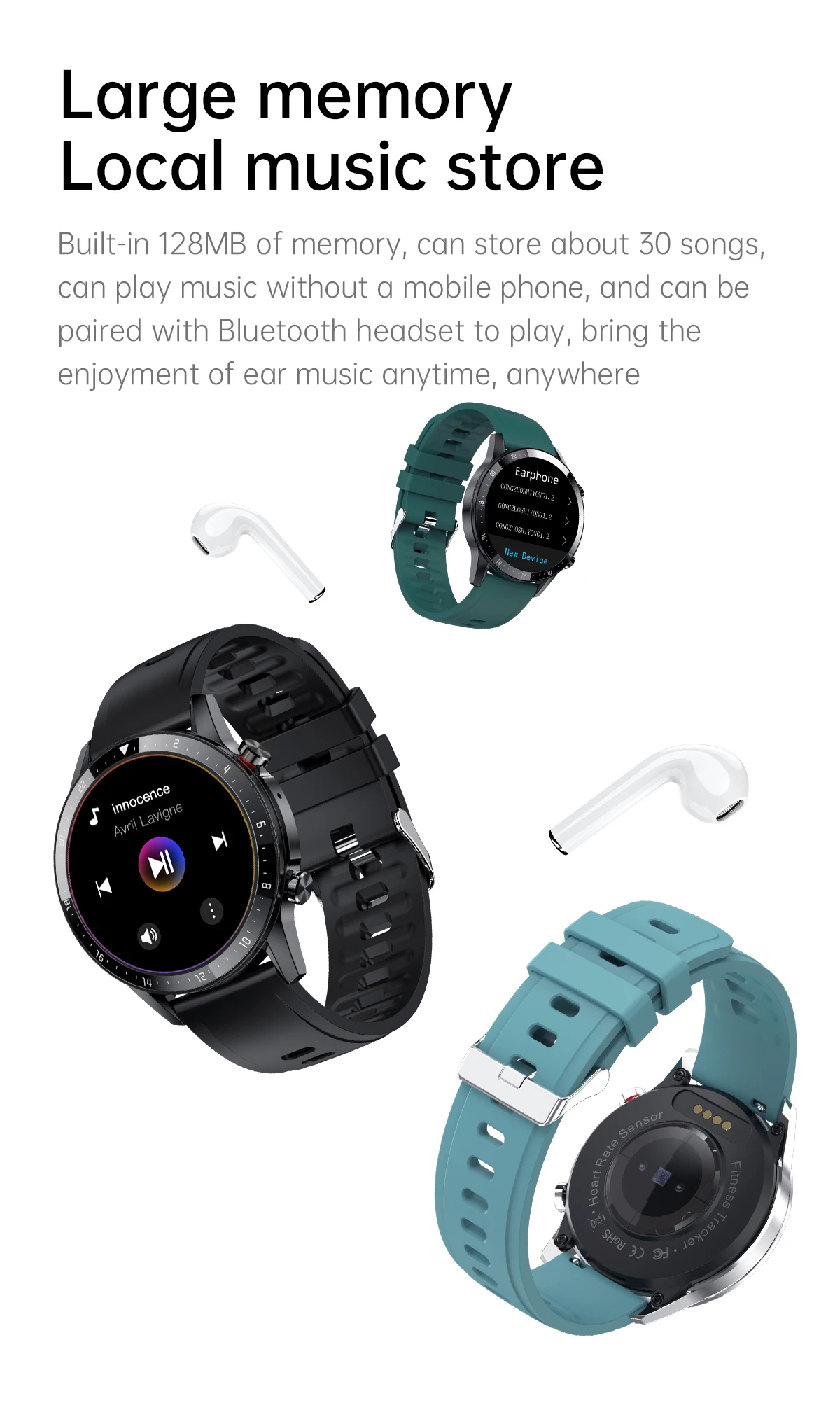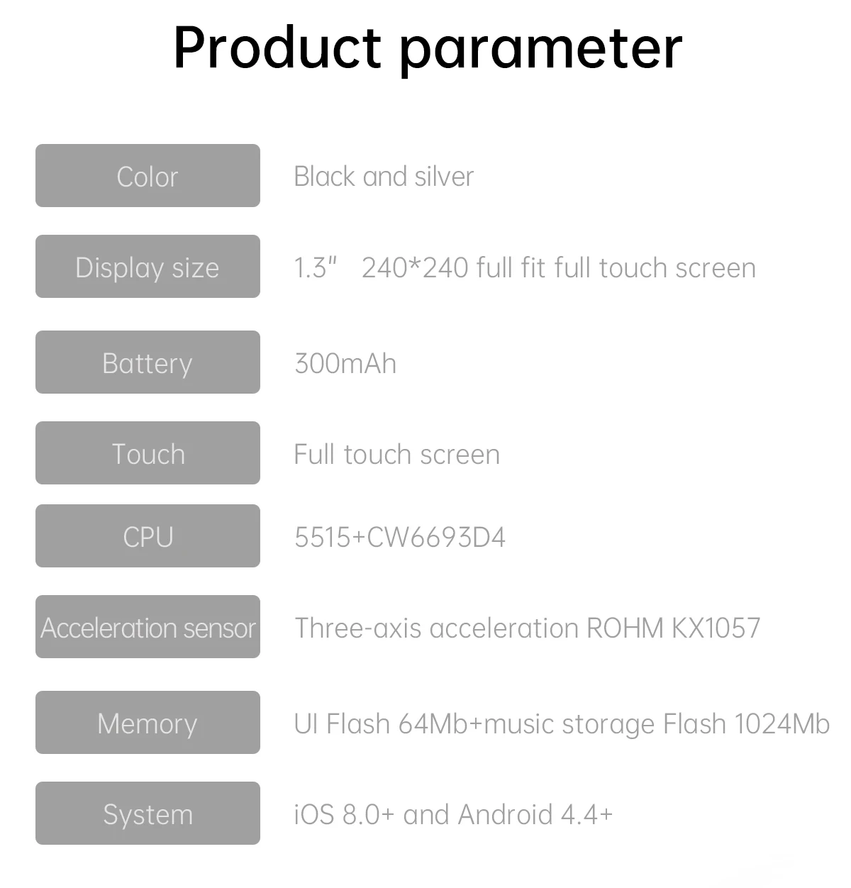 Photoelectric sensor: independent matching + Everlight PD70 Acceleration sensor: three-axis acceleration Rohm KX1057 RAM: 256KB ROM: 1MB Storage: external UI Flash 64Mb + music storage FLASH: 128M Waterproof: IP67 Screen: 240*240mm, fully fit and full touch screen Battery: polymer 300 mAh Bottom shell: ABS+PC Front shell: zinc alloy, glass Body size: diameter 46mm, thickness 13.2mm Bare metal weight: 66g Bluetooth: 4.0 Support mobile phone version: iOS 8.0 and above Android 4.4 and above