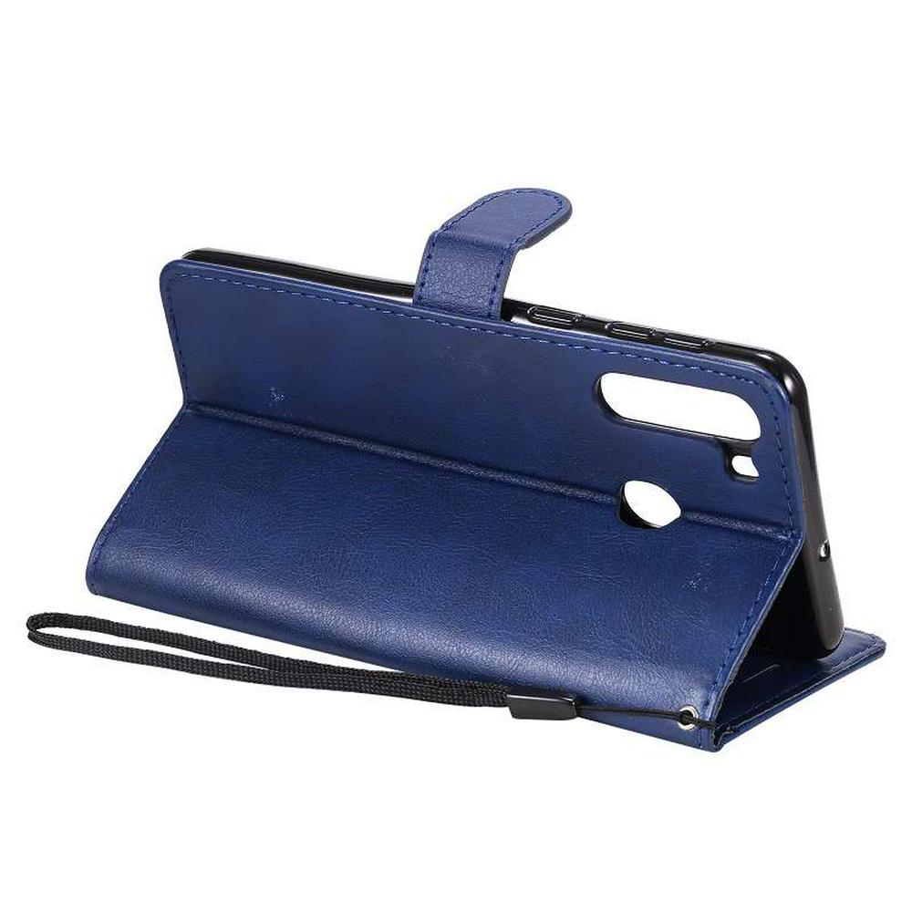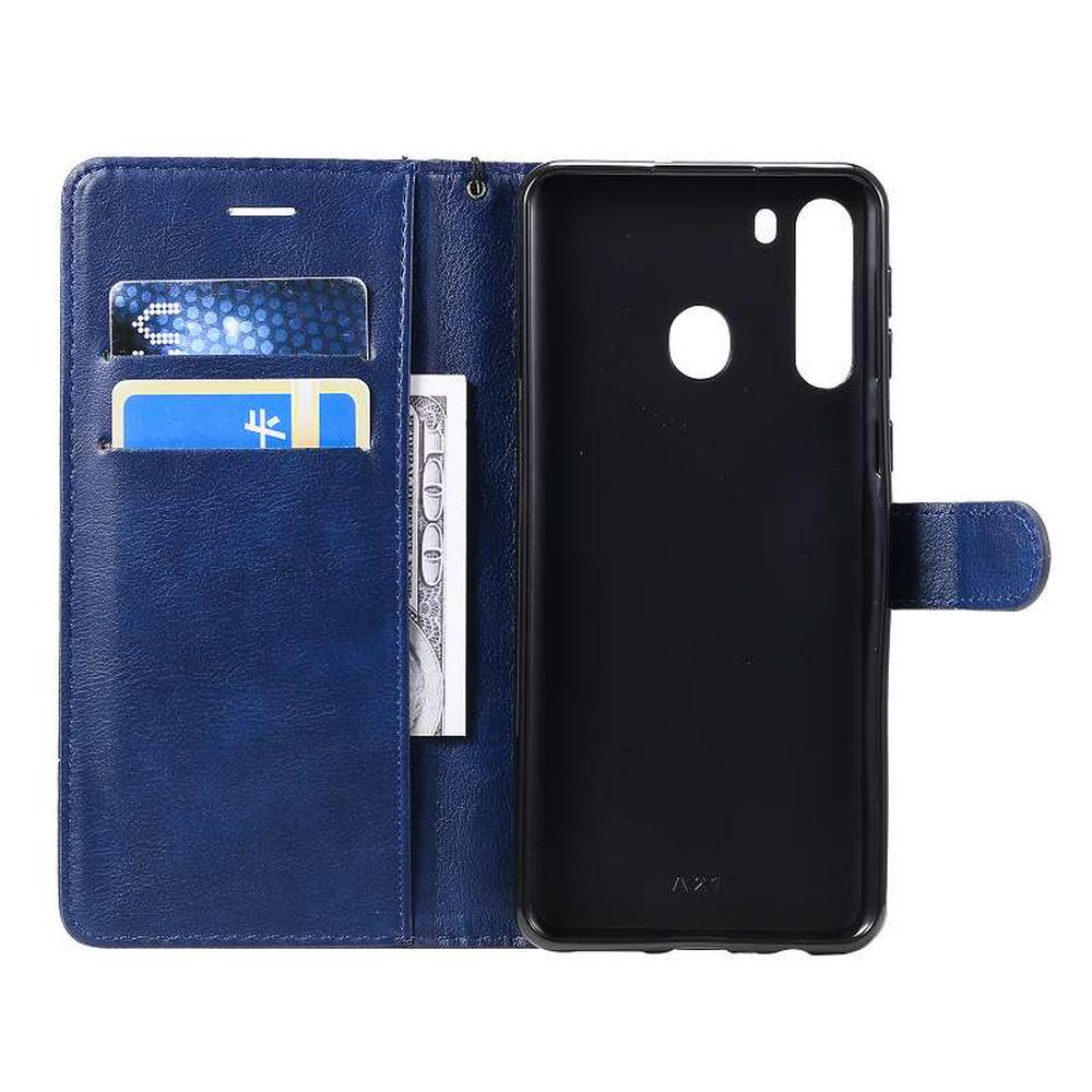 Solid Color Wrist Strap Style Shockproof Side Flip PU Leather + Soft TPU Card Slots with Magnetic Buckle and Stand Wallet Case for Samsung Galaxy A21