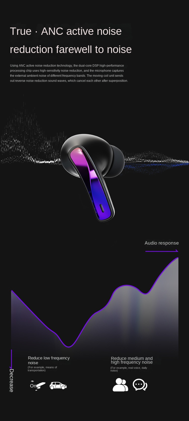 4. The headphones are equipped with two modes: noise reduction and environmental monitoring, which can be switched at any time;