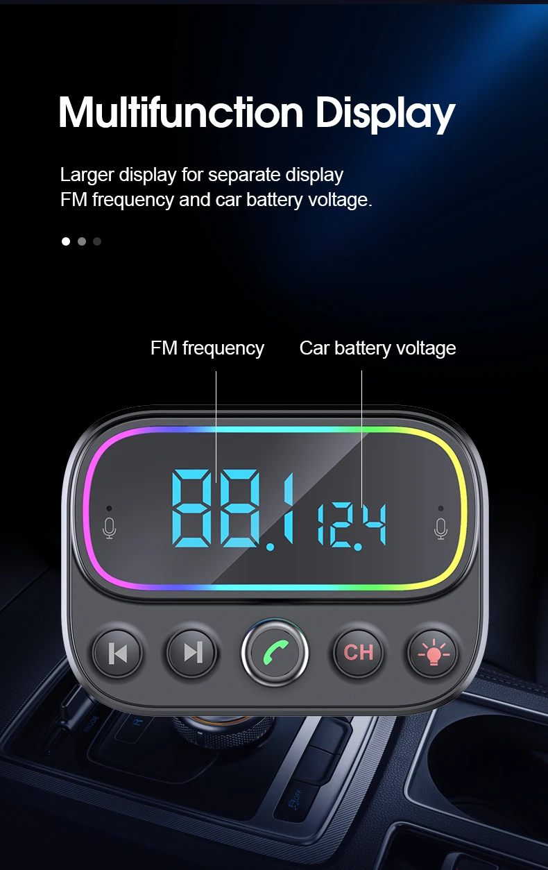 【 LED Screen + Colorful Lights】The color screen displays the FM Frequency, Voltage information; with separate Button to control colorful LED Light.