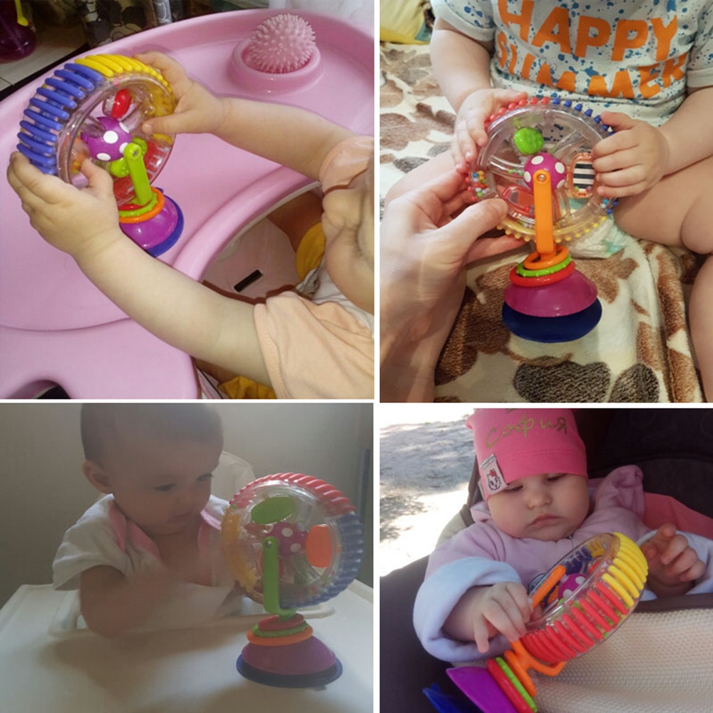 The base is equipped with a suction cup that can be sucked on a smooth object such as a dining car,a floor,etc.It is also possible to use a suction pad to safely place the Ferris wheel on a high chair for the baby to play.