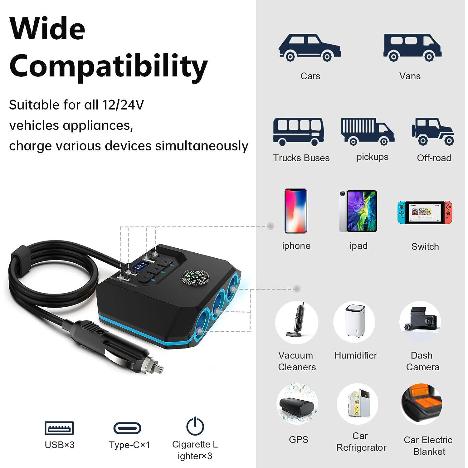 1.With excellent design and quality, this multi-function power splitter is suitable for all 12V/24V cars and can meet your needs on the road trip.