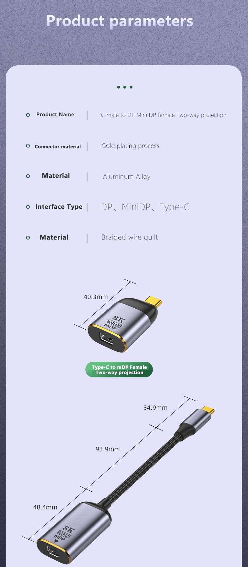 Gold-plated USB-C to MINI-DP monitor cable Video 8K,4K UHD 2160p, HD 1080p, connectors, tinned copper wire, durable Nylon Braided, aluminum slim case, all of them ensure strong connectivity between devices