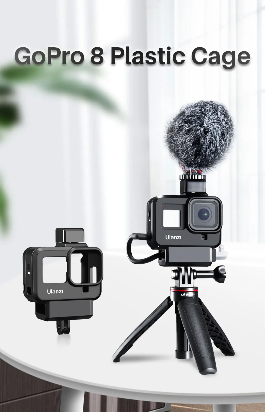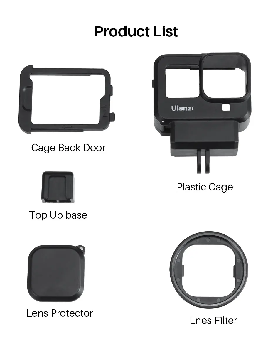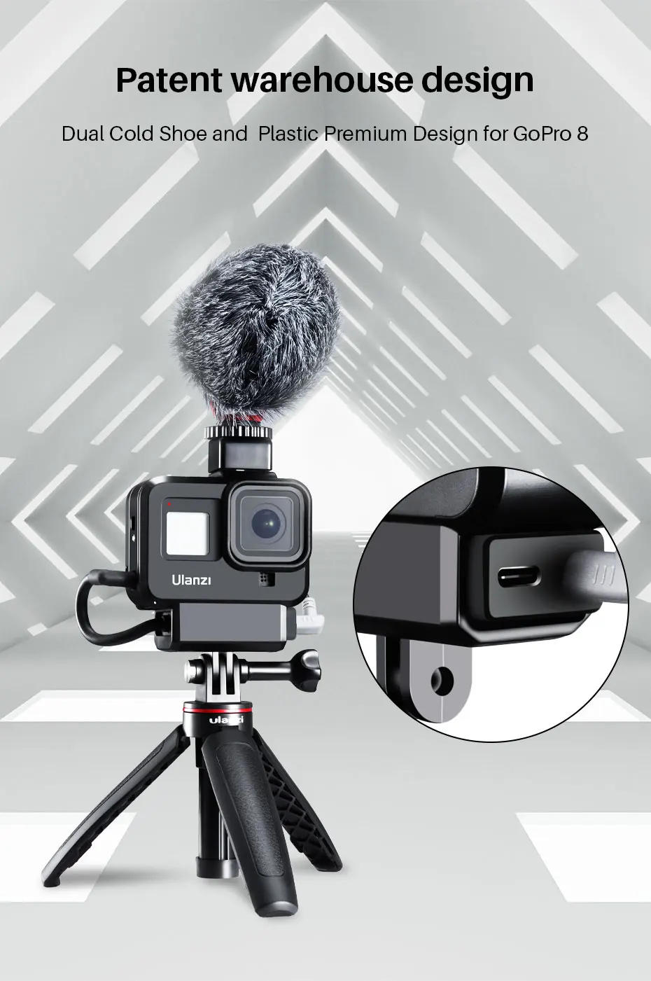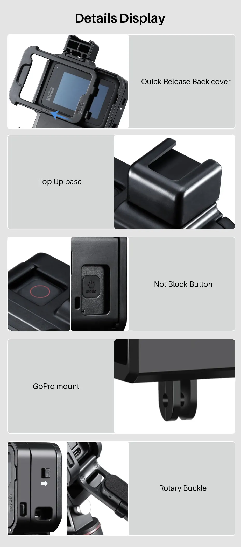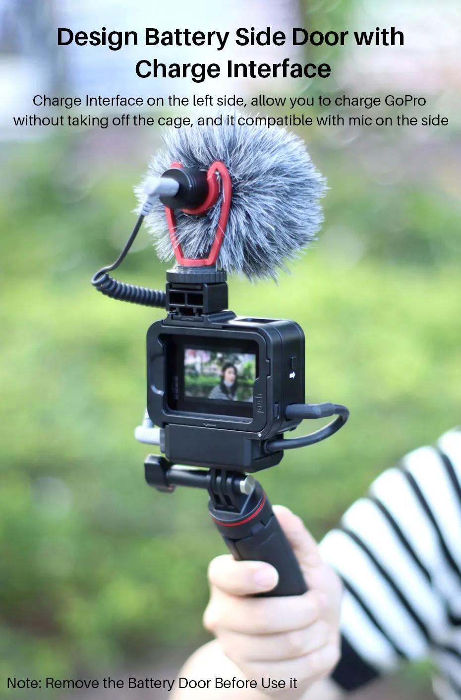 Design battery side door with charge interface:Charge interface on the left side,allow you to charge GoPro without taking off the cage,and it compatible with mic on the side.
