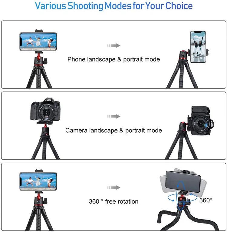 The octopus shape tripod plays an important role in shooting for various and different angles. In addition, it is more durable and can be used for a long time. It is really a wonderful tool for each photographer. Owing such a practical tool, you can strike different poses for photo shooting at ease. Main Features: - Feature with octopus shape design, high flexibility and fine attractiveness - It can stand stably in any situation - Adopting superb material, durable in using - Help you to get a broader background picture - Compact and lightweight, easy to carry anywhere as you like - Ideal companion for your camera during your travel Hidden Phone Tripod Mount with Cold Shoe------The phone tripod comes with a smartphone holder with a cold shoe mount, allows you to mount a microphone or led video light for selfie Vlog 1/4 Thread for Extension------The camera flexible tripod has a 1/4‘ thread, allows you to mount a minotor magic arm(not included) Wide Compatiblity------There is a universal 1/4 srcew to mount a DSLR camera, sony canon nikon; the range size of phone holder is from 65-95mm, compatible with iphone 11/11 pro/11 pro max/xs/xs max/8 plus/Samsung note 10/galaxy s10 Vertical & Horizontal Shooting------The ball head allows the smartphone clip 180° rotation, no matter phone or camera, support veritical and horizontal shooting Camera Flexible Tripod------The octopus camera tripod can be used as a tripod or selfie stick, the phone tripod can wrap on lampposts, fence posts, tree limbs, chairs, doorknobs etc