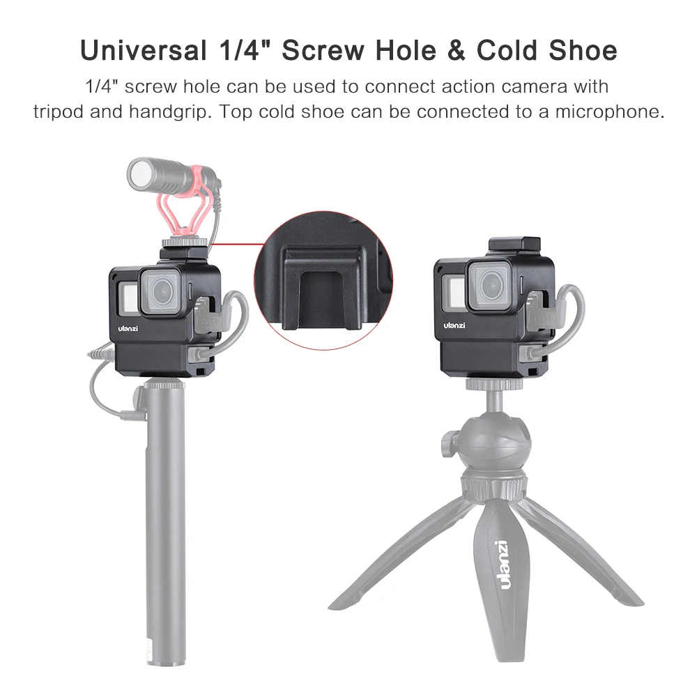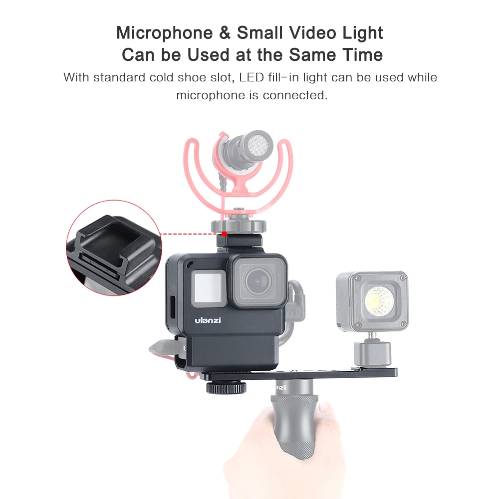 Top Cold Shoe Installation: The top has a cold boot installation, with a cold shoe pole, can be connected to the microphone while the LED fill light, which is required for GoPro video shooting.