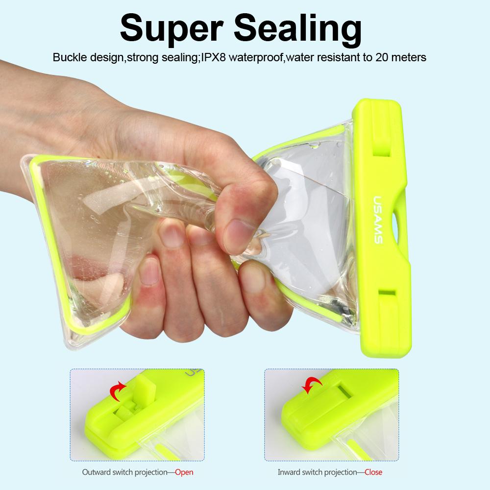 After used in the water, if need to take out the phone or the other, please let the seal down, so as to prevent the residual water into the waterproof bag.