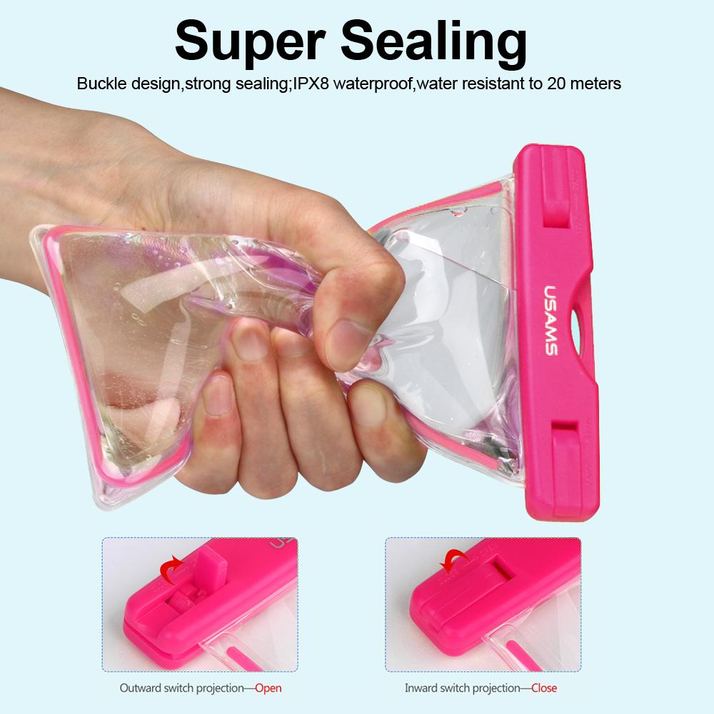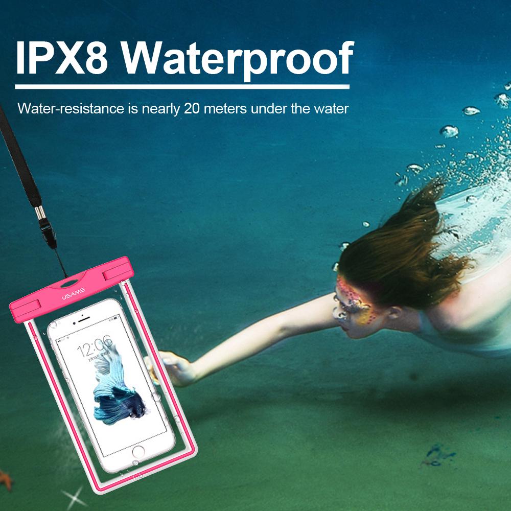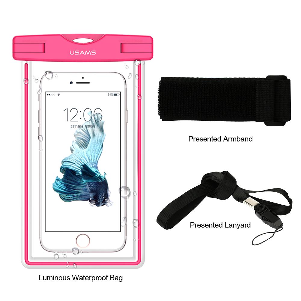 USAMS IPX8 Waterproof Transparent Luminous Window TPU Waterproof Bag for Cellphone Under 6 inch - Luminous Rose Red