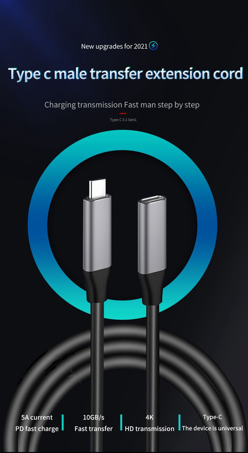 USB 3.1 Type C Cable Extension Cable 3A PD 60W Male to Female Fast Charging 4K 60HZ Video Transmission Cable Cord