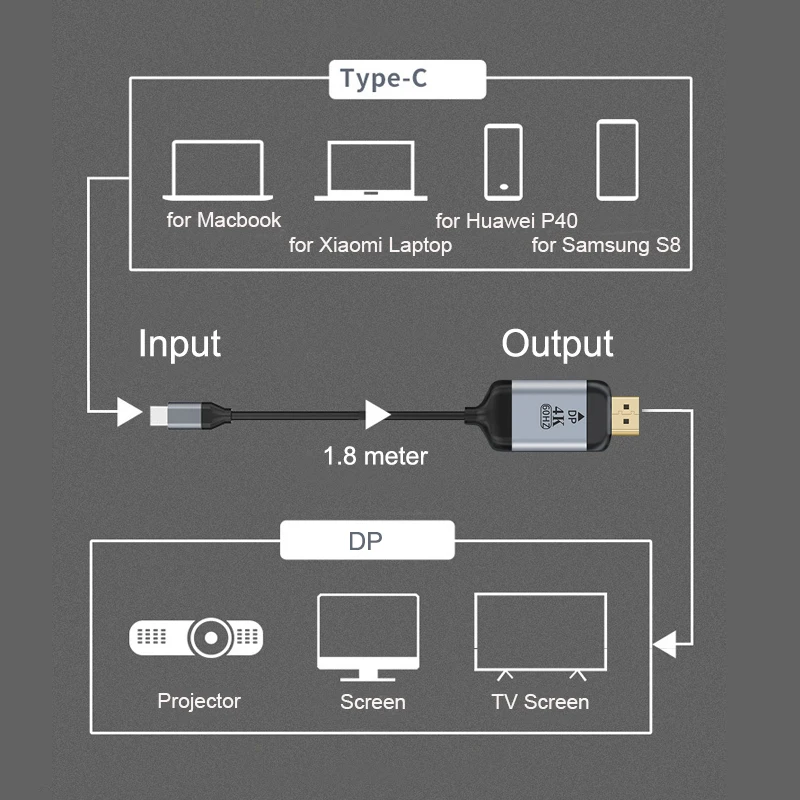This USB-C to DP cable is a convenient solution for connecting your USB-C device directly to your DP monitor, projector or TV, such as for MacBook, for Huawei Mate 30 Mate Mate10, P30/P20,for Samsung S10/S9/S8, for Dell XPS 15, etc. No Driver needed. Use the USB Type C DP cable cord to position your devices anywhere in your workspace as needed with less cable clutter.