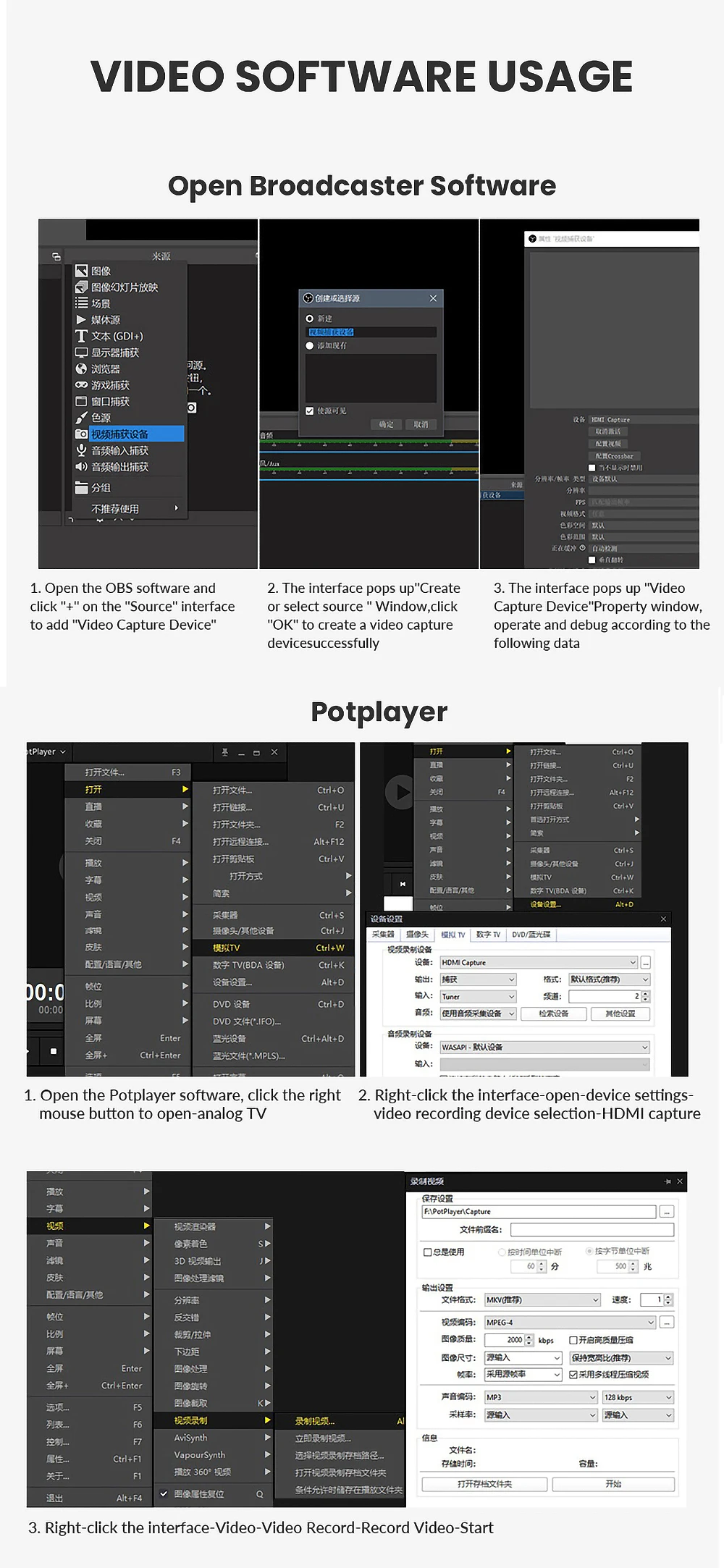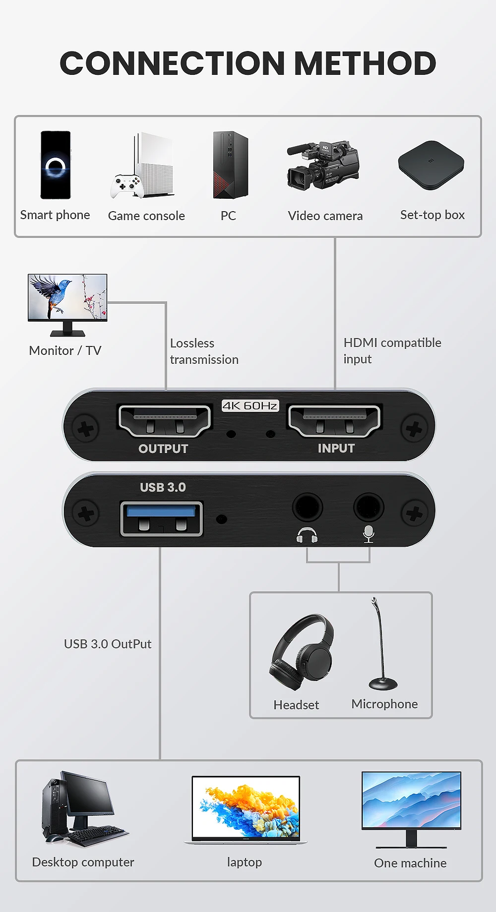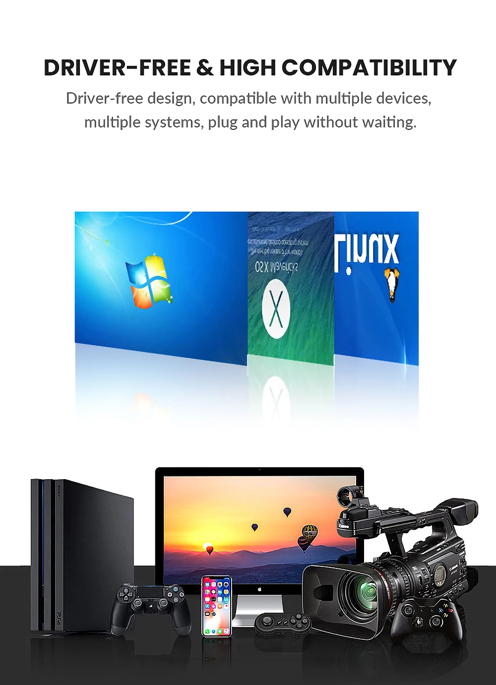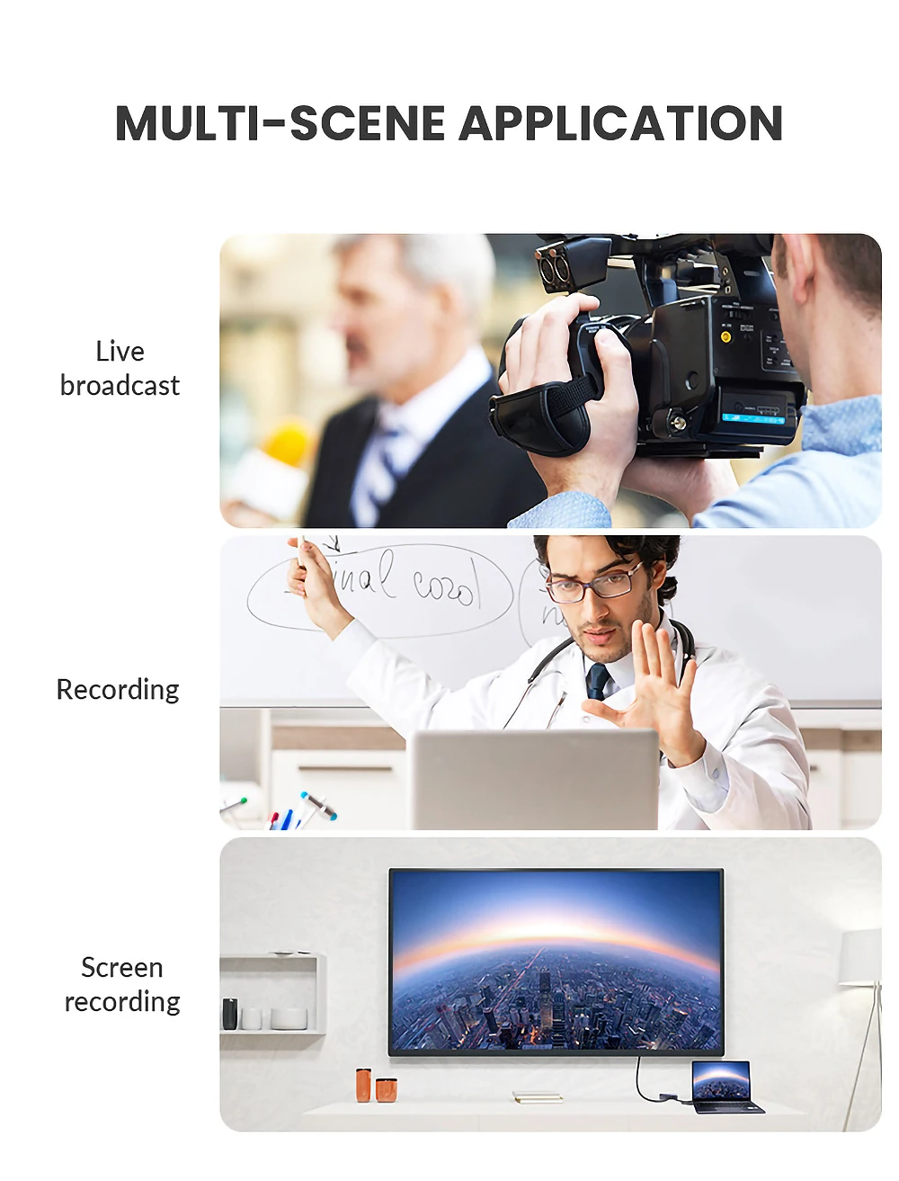 Connected to PC or mobile phone through USB3.0 interface, through many free third-party playback and acquisition software to achieve preview, recording, acquisition, live broadcast and other functions, HDMI video acquisition meets UVC and UAC standards, easy to use.