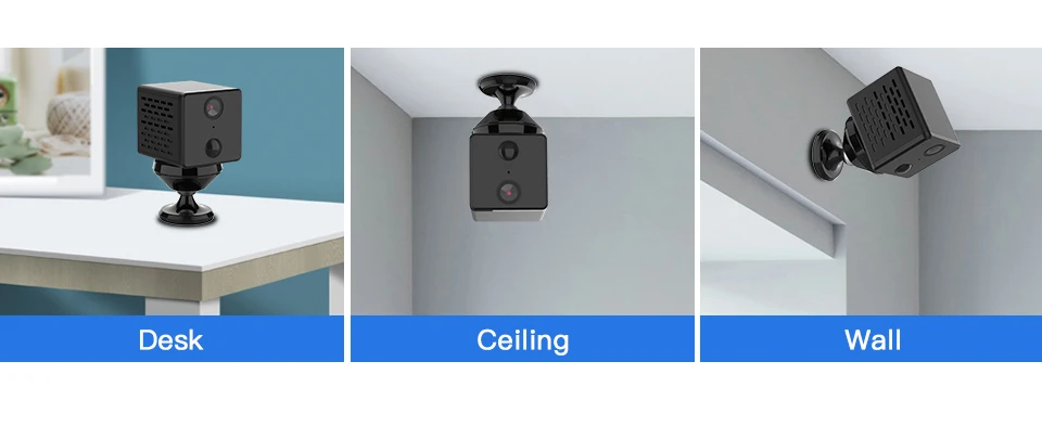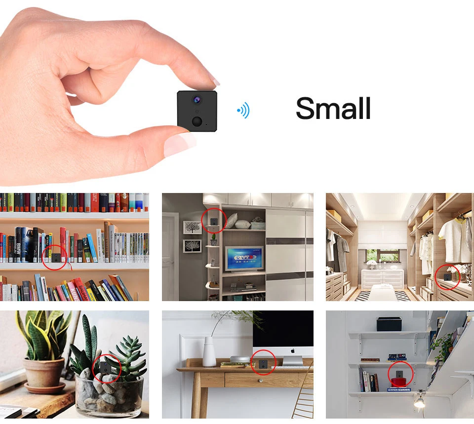 The camera is just 36.5 x 36.5 x 40mm, about 60g, mini size, you can put it on the bookshelf, bury it around the books, jut show the lens out, not easy to be find by others.