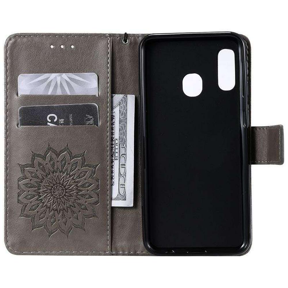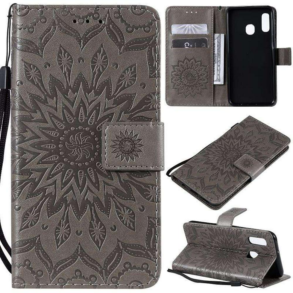 Wallet Case for Samsung Galaxy A20e, Motif-debossed Leather Phone Case with Wrist Strap