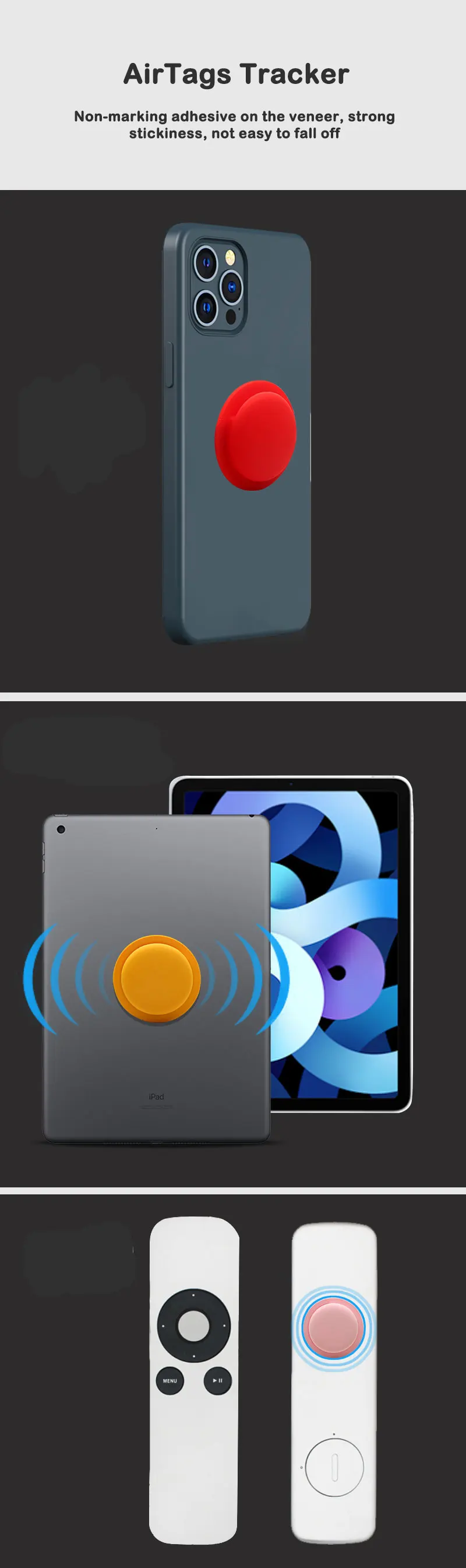 Premium Quality Material: This protective case is professionally designed for Airtags. It is made of comfortable soft liquid silicone. Full Protection & Excellent Comfort: We designed this case to protect your device for Airtags professionally. Easy to Install: Can be adhered to earphones, mobile phones, chargers, remote controls, backpacks, etc. What You will get: 1*Protective Cover for Airtags. (only the silicone case for sale, not including the device for Airtags) Comfortable & Durable: This case is made of environmentally friendly liquid silicone, odorless, sweat-proof, scratch-resistant, and washable.