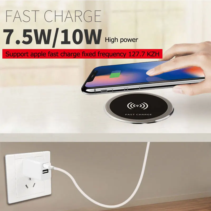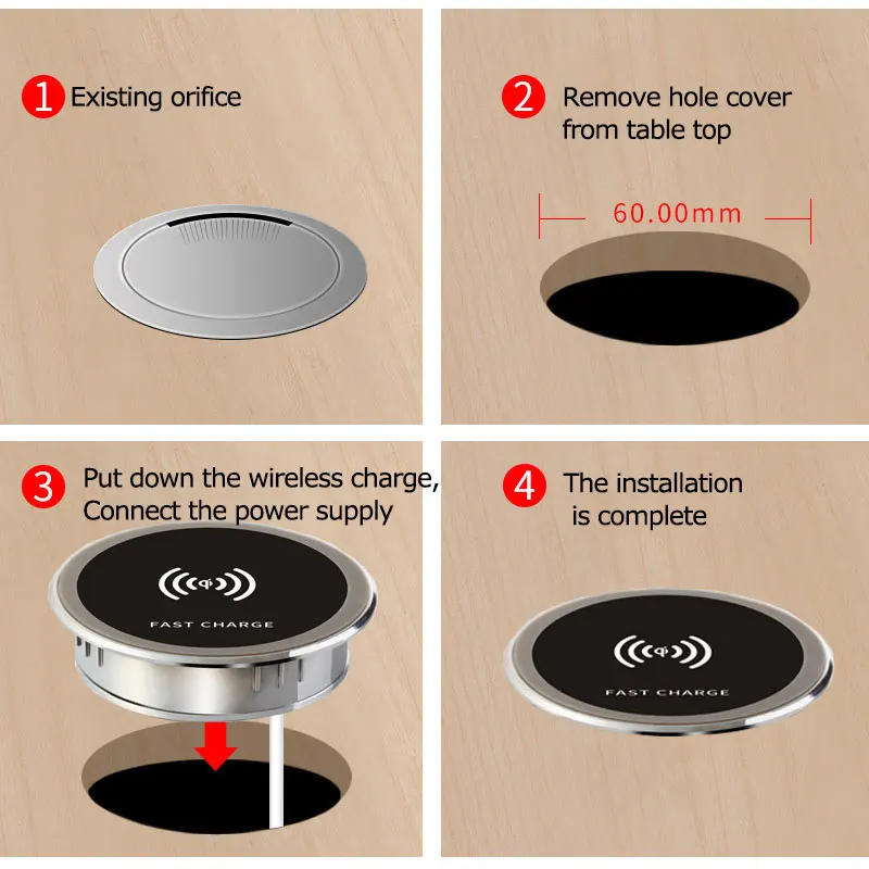 The table charging pad is compatible with 15w, 10w, 7.5w and 5w wireless charging smart phone, designed for 6cm diameter hole on table. Specification: