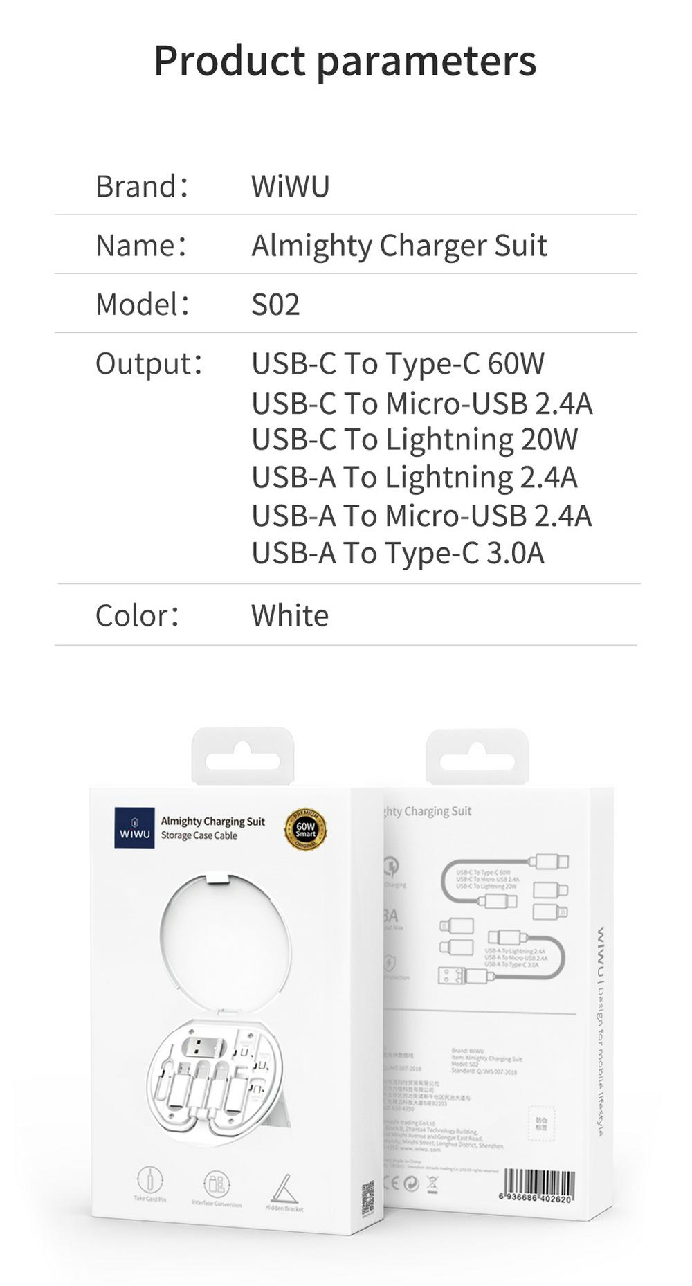 WiWU 4 in 1 Set Cable Type C to USB -C Micro PD Fast Charging Port Easy to Carry USB-C to Adapter Charger Cable