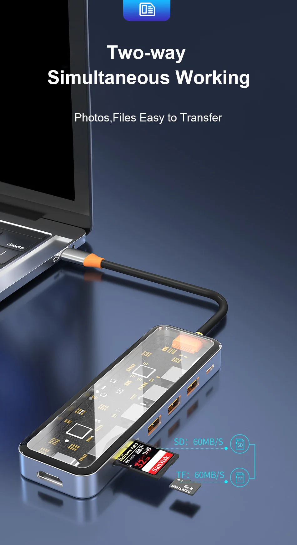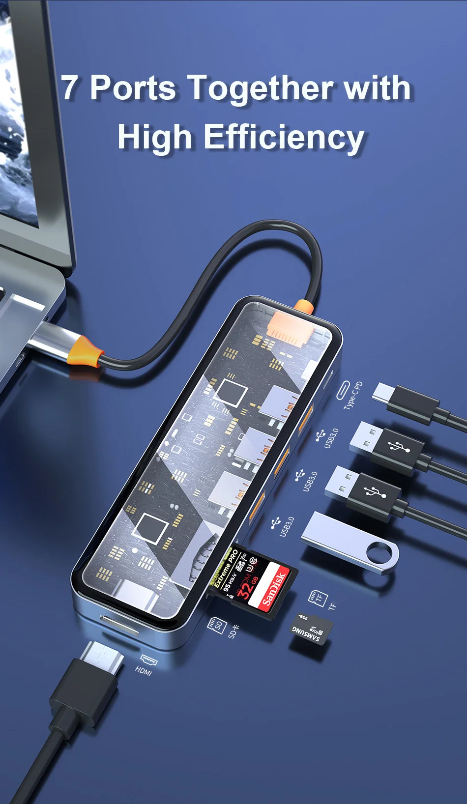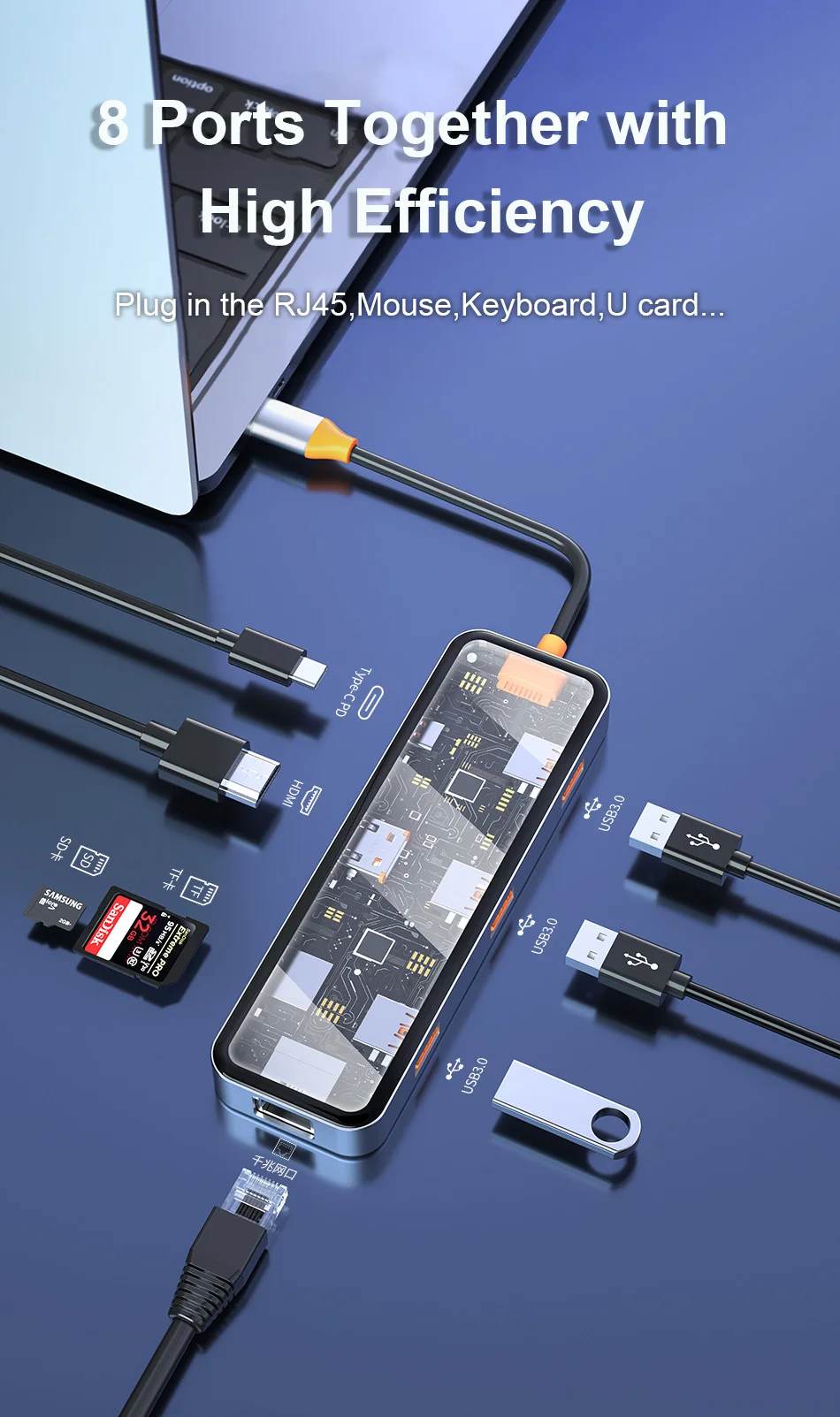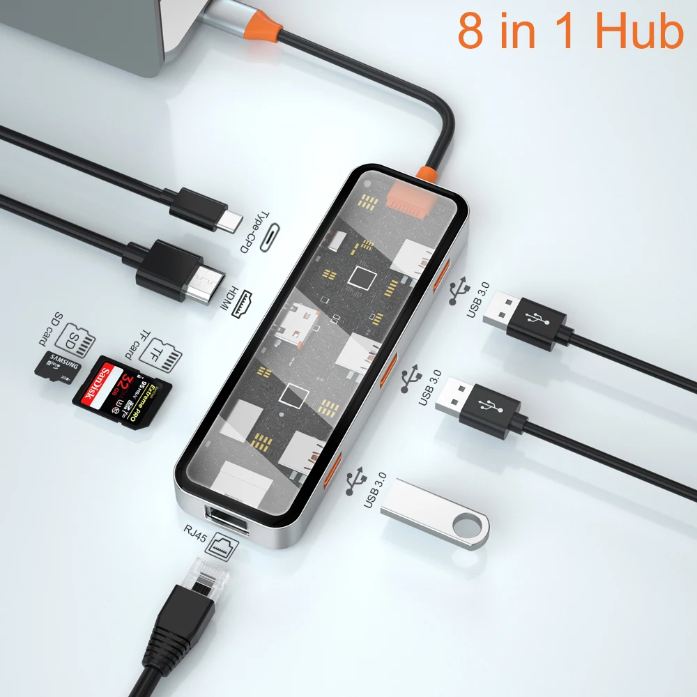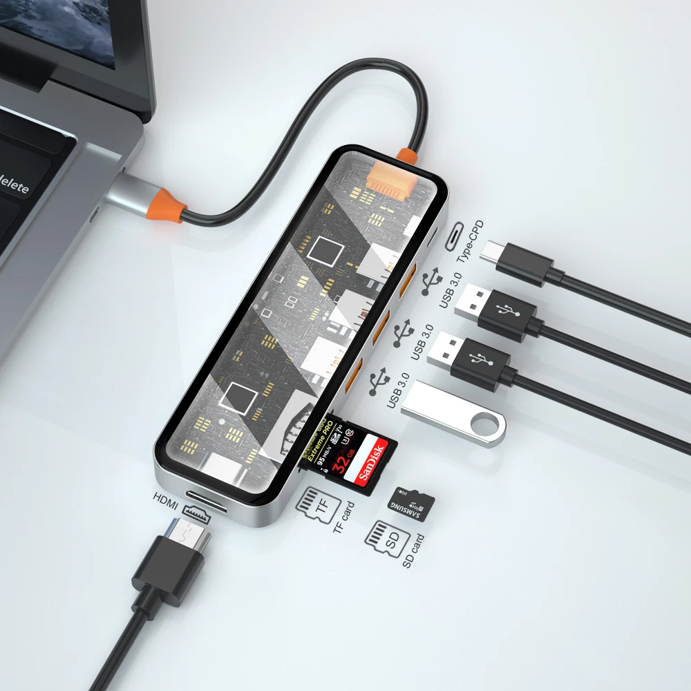 USB3.0*2+USB2.0*1+SD/TF(3.0)+HDMI(4K30)+PD+RJ45