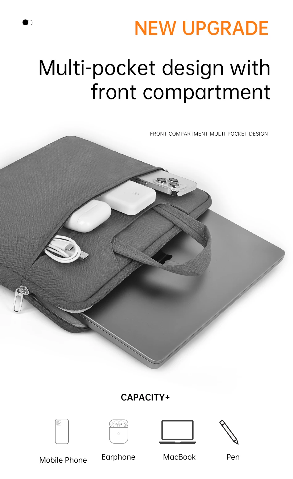 3.Front compartment with multi-pockets for digital gadgets.