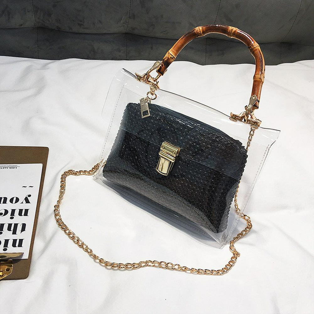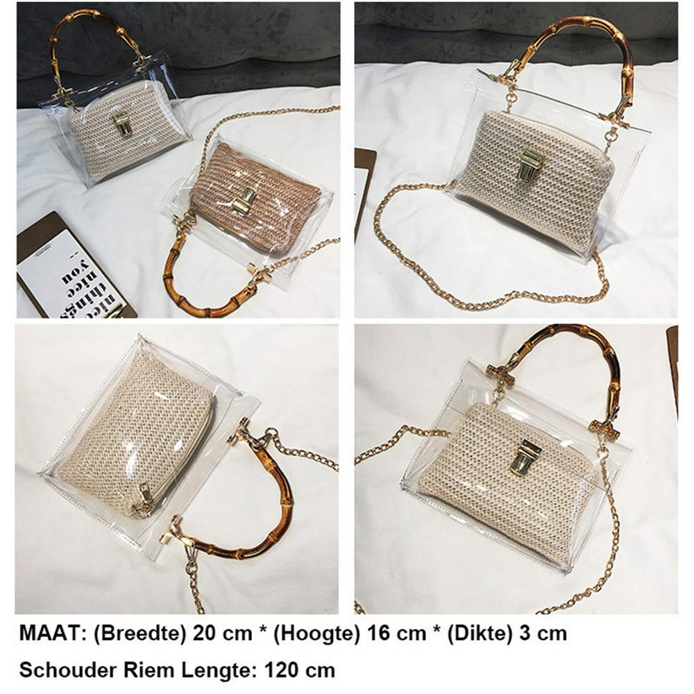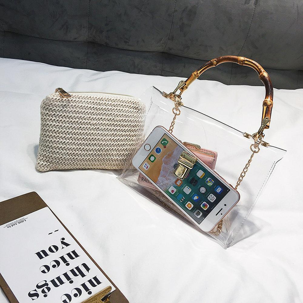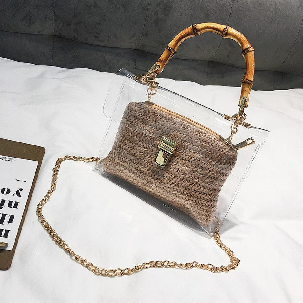 Women's 2 in 1 Handbag External Clear Waterproof Handbag and Internal Straw-plaited Clutch Bag